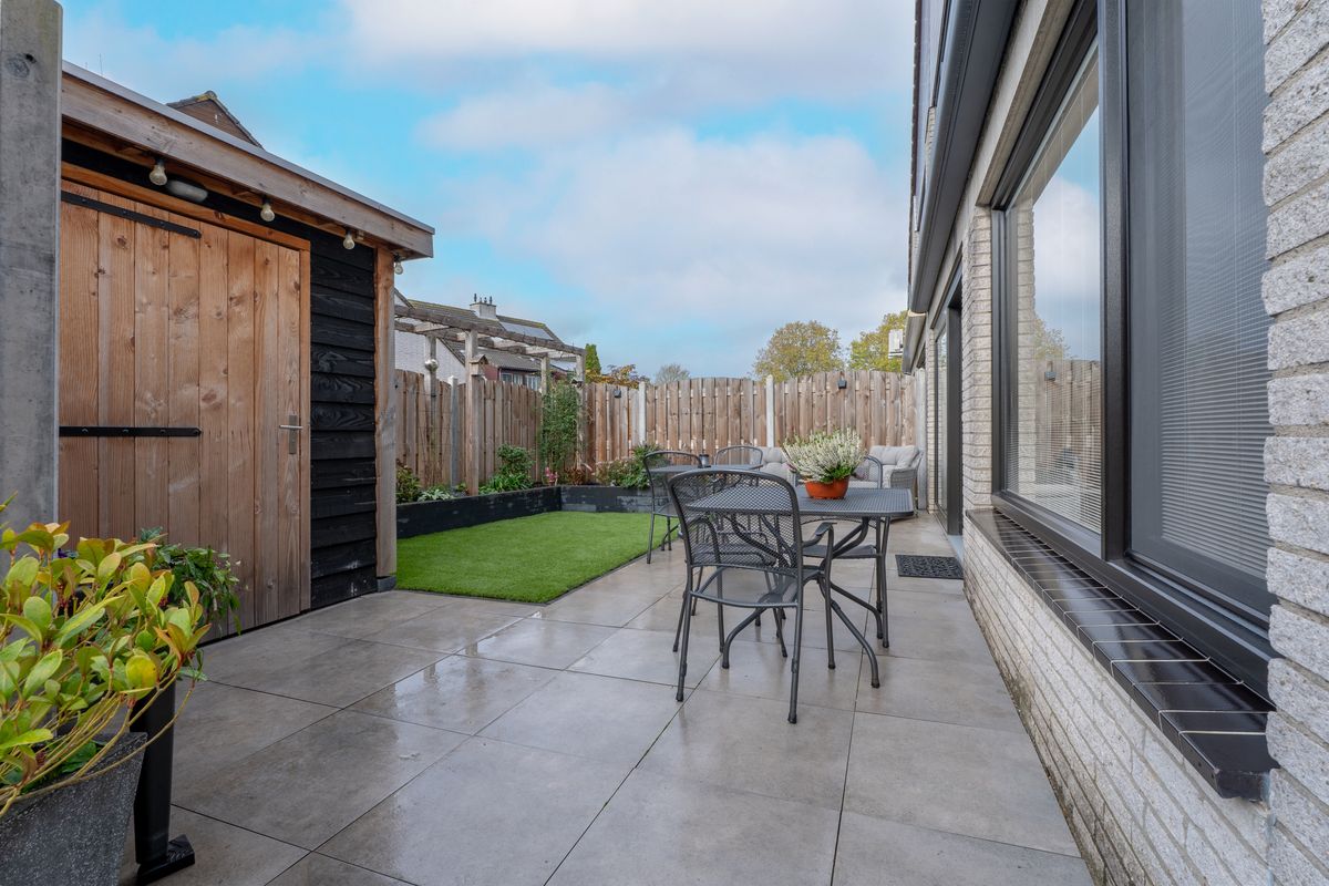 De tuin (ca. 50 m²) ligt op het zuidwesten en biedt door de hoekligging de hele dag zon. De tuin is voorzien van een elektrisch zonnescherm (2024), achterom en een stenen berging.