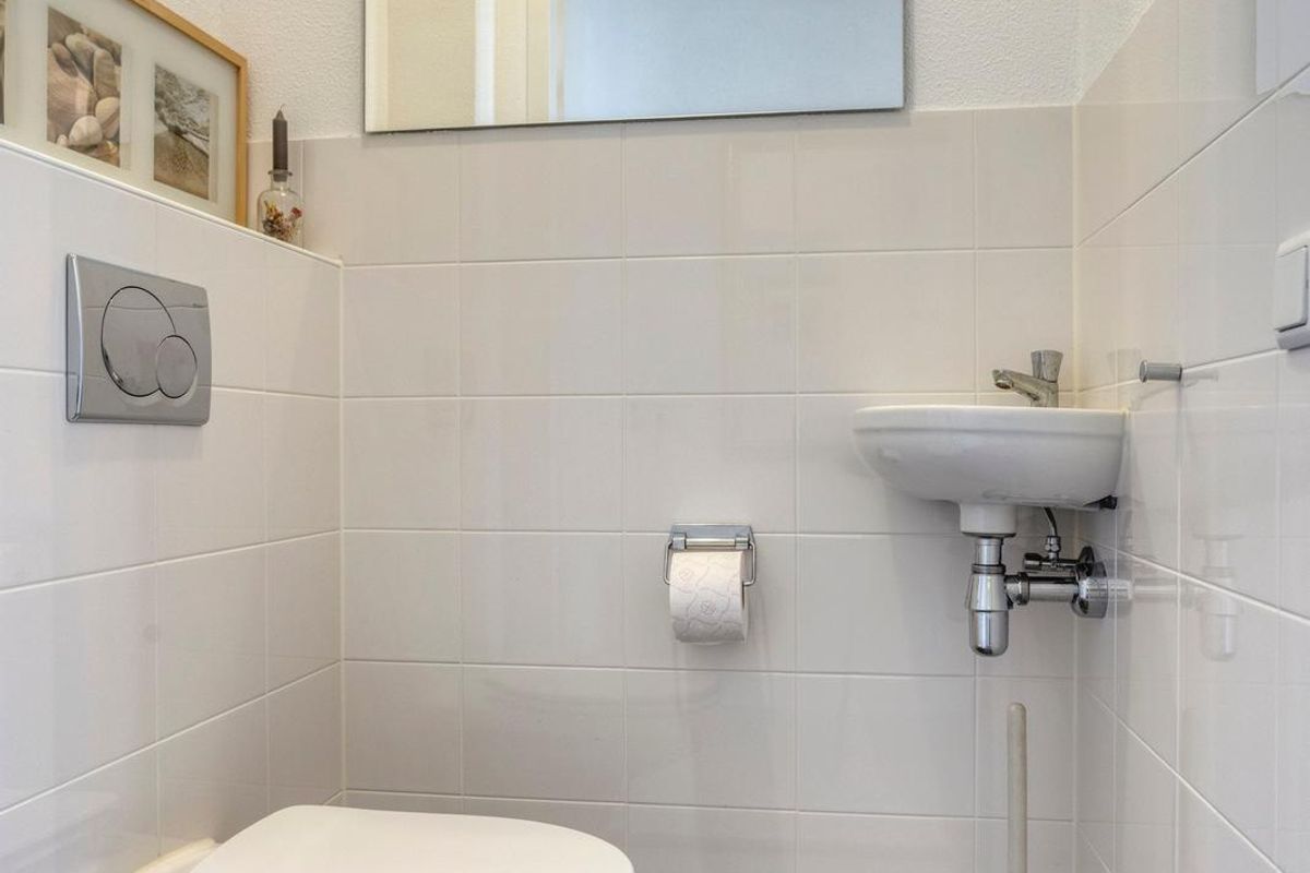 De gedeeltelijke betegelde toiletruimte is ingericht met een wandcloset en een fonteintje.