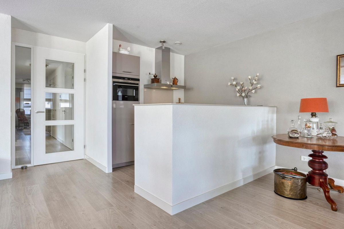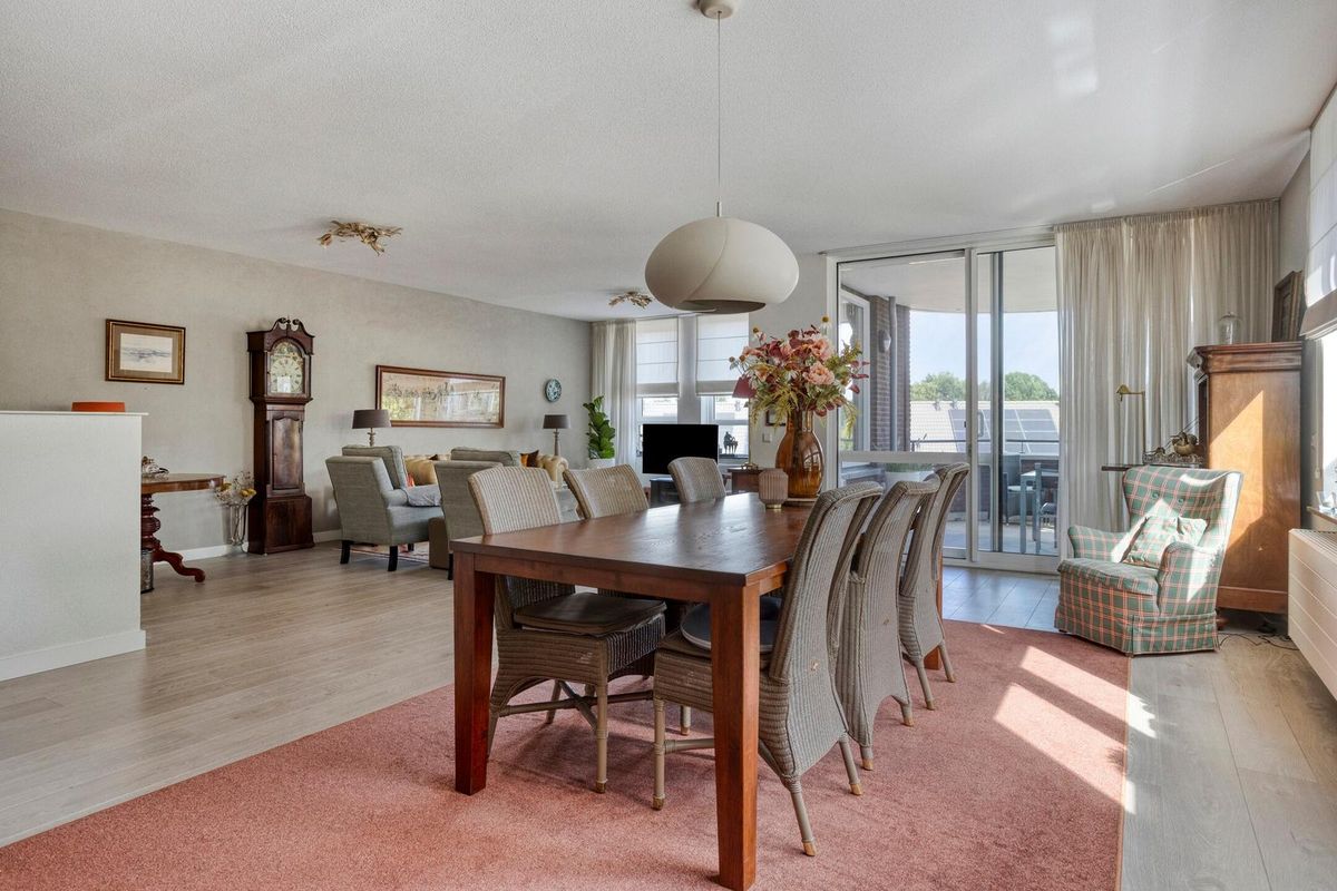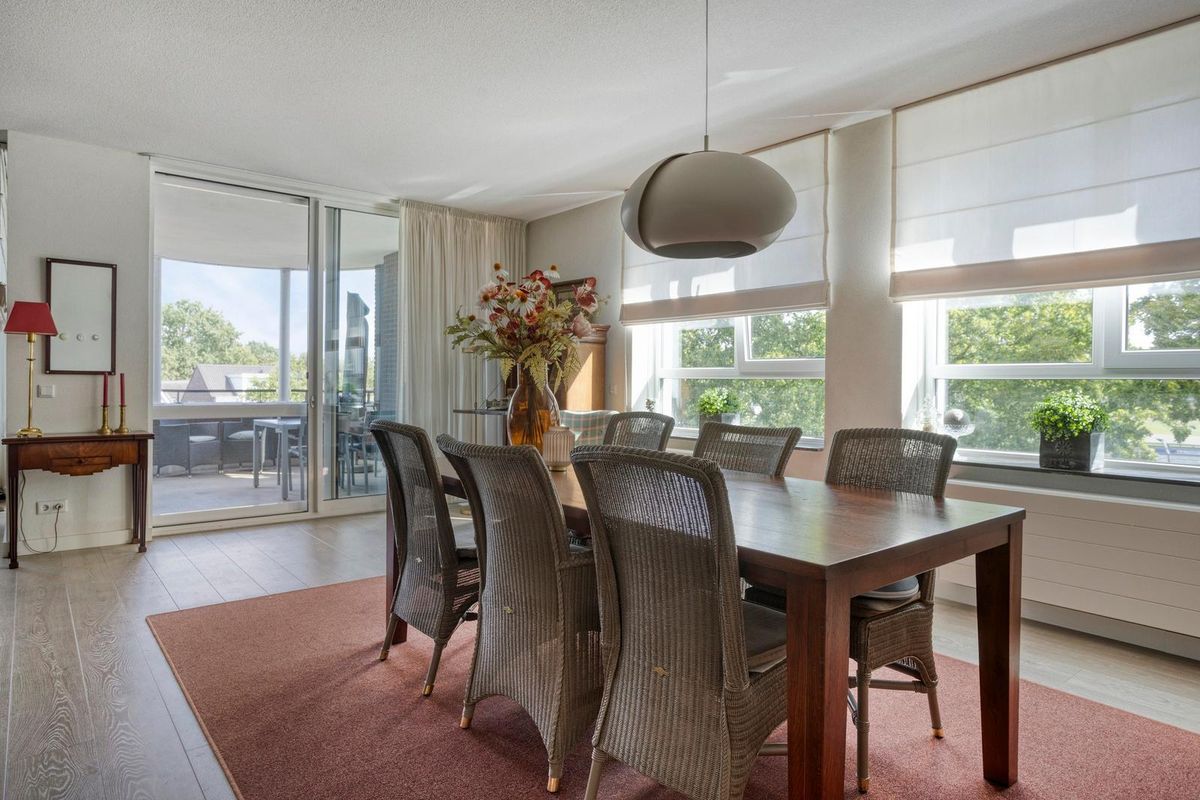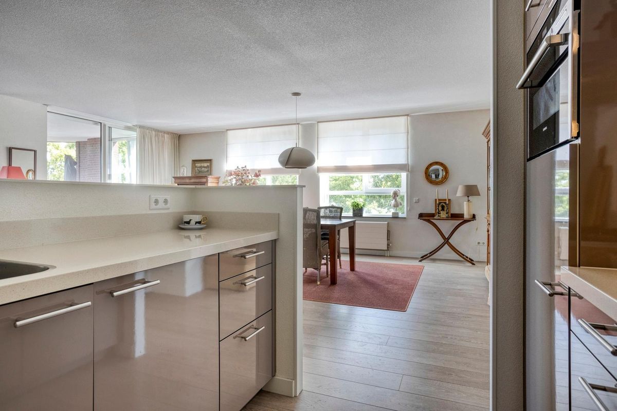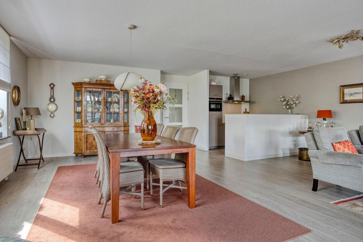 De woonkamer heeft een sfeervolle uitstraling en is buitengewoon ruim van opzet (ca. 65m²). Het is tevens een heerlijke lichte verblijfsplek met vele brede raampartijen in de voor- en zijgevel die het daglicht prettig diep de leefruimte binnenbrengen en prachtig zicht bieden op de omliggende buitenruimte. Mede door de ligging op de bovenste bouwlaag van het complex kan men vanuit hier fantastisch ver en in diverse kijkrichtingen wegkijken. Ook de eethoek, gelegen bij de halve ronding, vormt een bijzonder aangename plek om te genieten van het uitzicht. De afwerking bestaat uit een pvc-laminaatvloer, gestucte wanden en plafond.