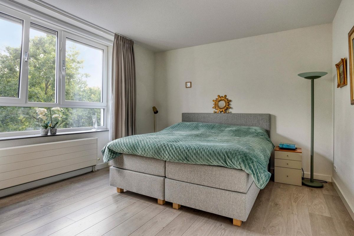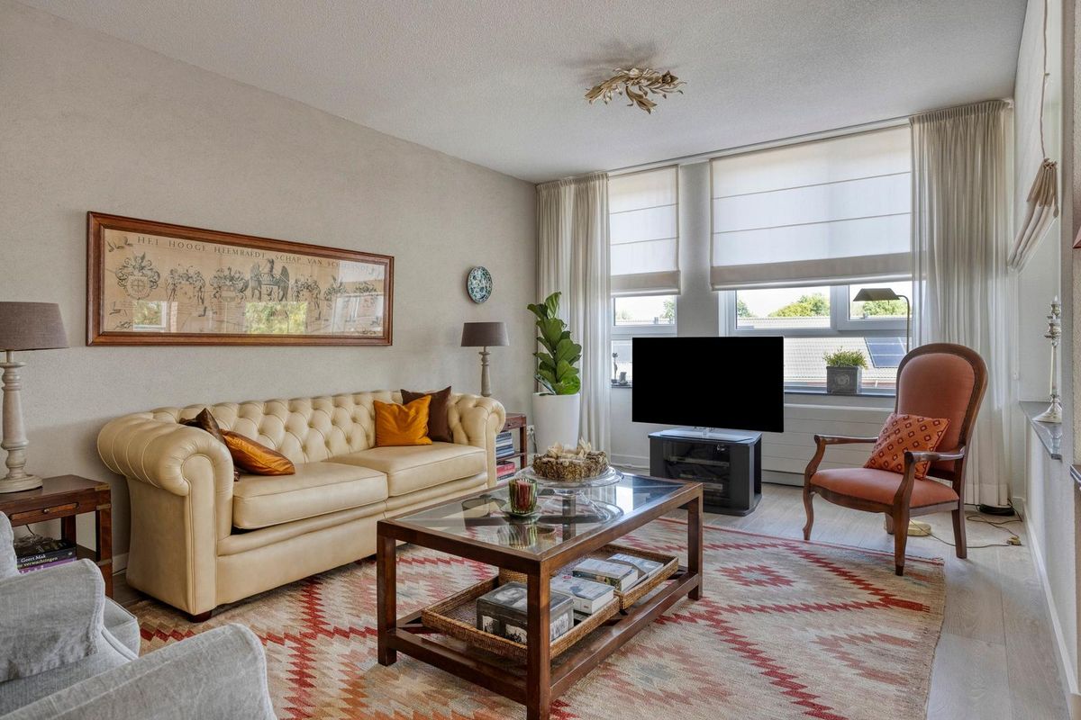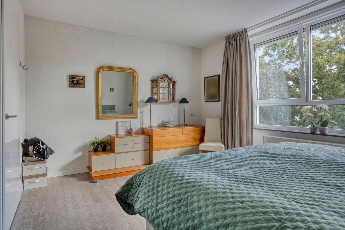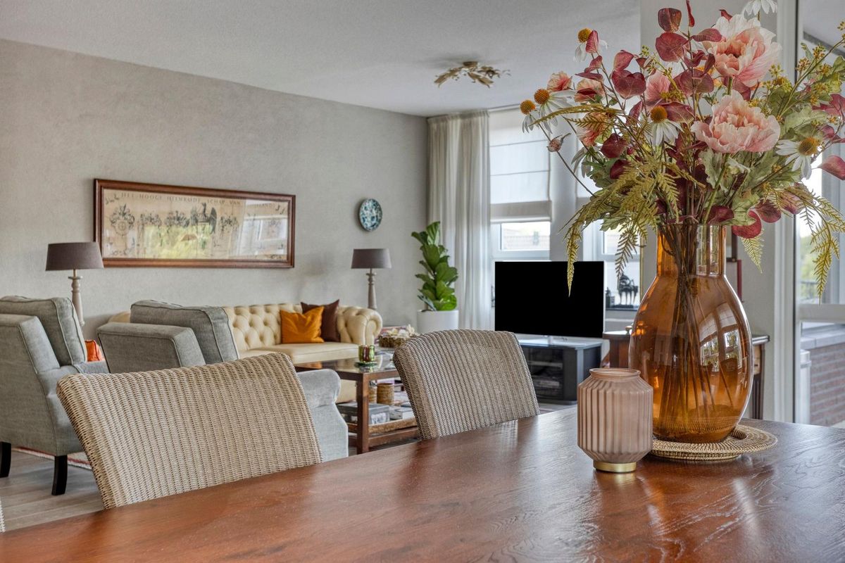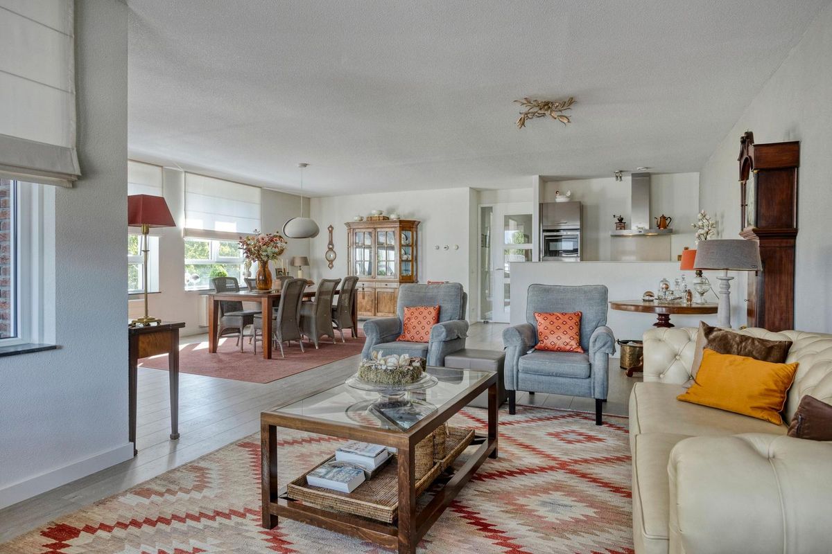 De woonkamer heeft een sfeervolle uitstraling en is buitengewoon ruim van opzet (ca. 65m²). Het is tevens een heerlijke lichte verblijfsplek met vele brede raampartijen in de voor- en zijgevel die het daglicht prettig diep de leefruimte binnenbrengen en prachtig zicht bieden op de omliggende buitenruimte. Mede door de ligging op de bovenste bouwlaag van het complex kan men vanuit hier fantastisch ver en in diverse kijkrichtingen wegkijken. Ook de eethoek, gelegen bij de halve ronding, vormt een bijzonder aangename plek om te genieten van het uitzicht. De afwerking bestaat uit een pvc-laminaatvloer, gestucte wanden en plafond.