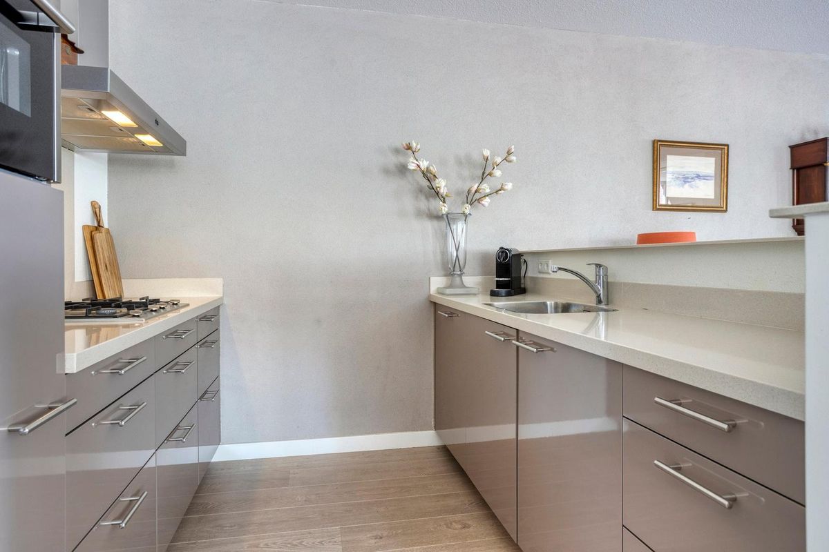 De open keuken is voorzien van een inrichting in rechte wandopstelling afgewerkt met een composiet werkblad en een spoelbak. De inbouwapparatuur bestaat uit een gaskookplaat, afzuigkap, koelkast, vriezer, combi-magnetron en een vaatwasser. Diverse bergkasten zorgen voor de benodigde opbergruimte.