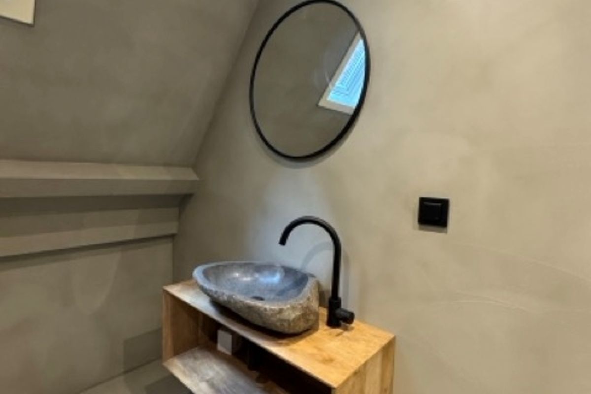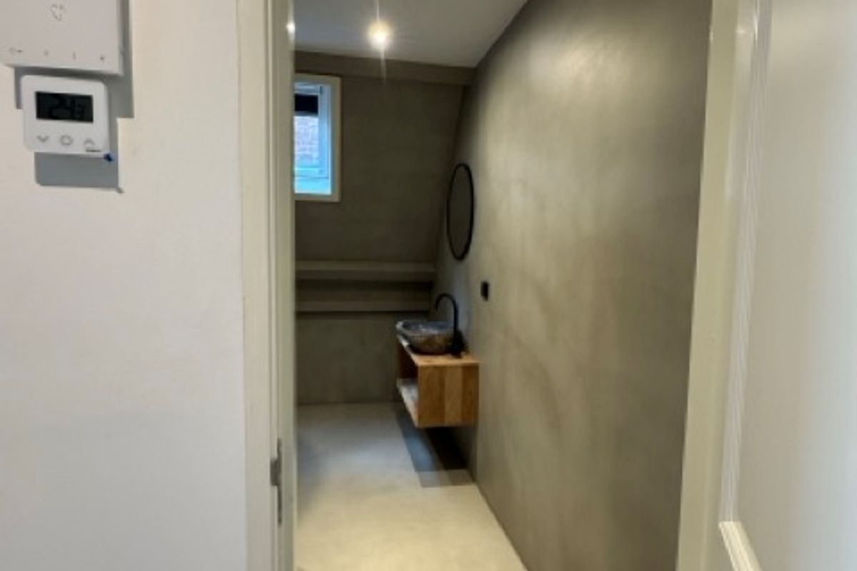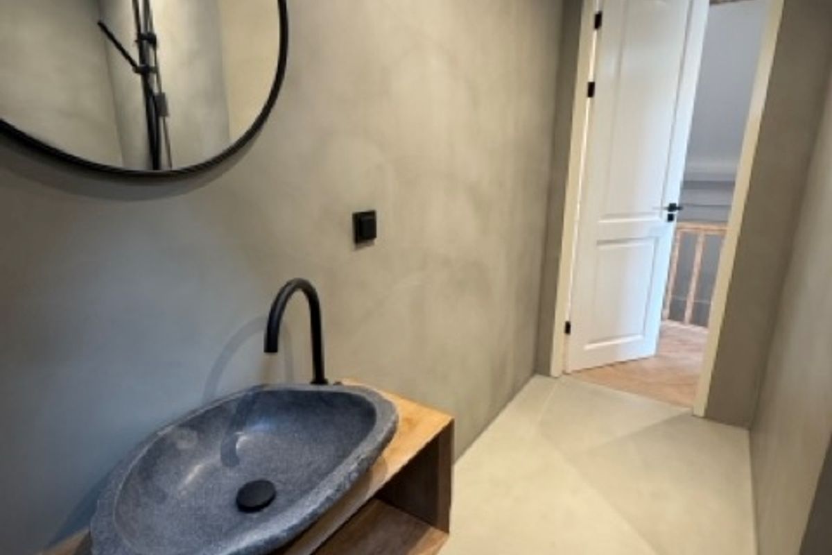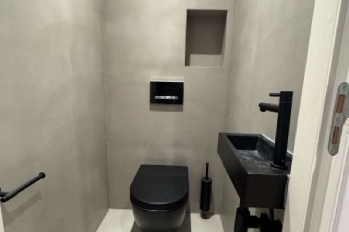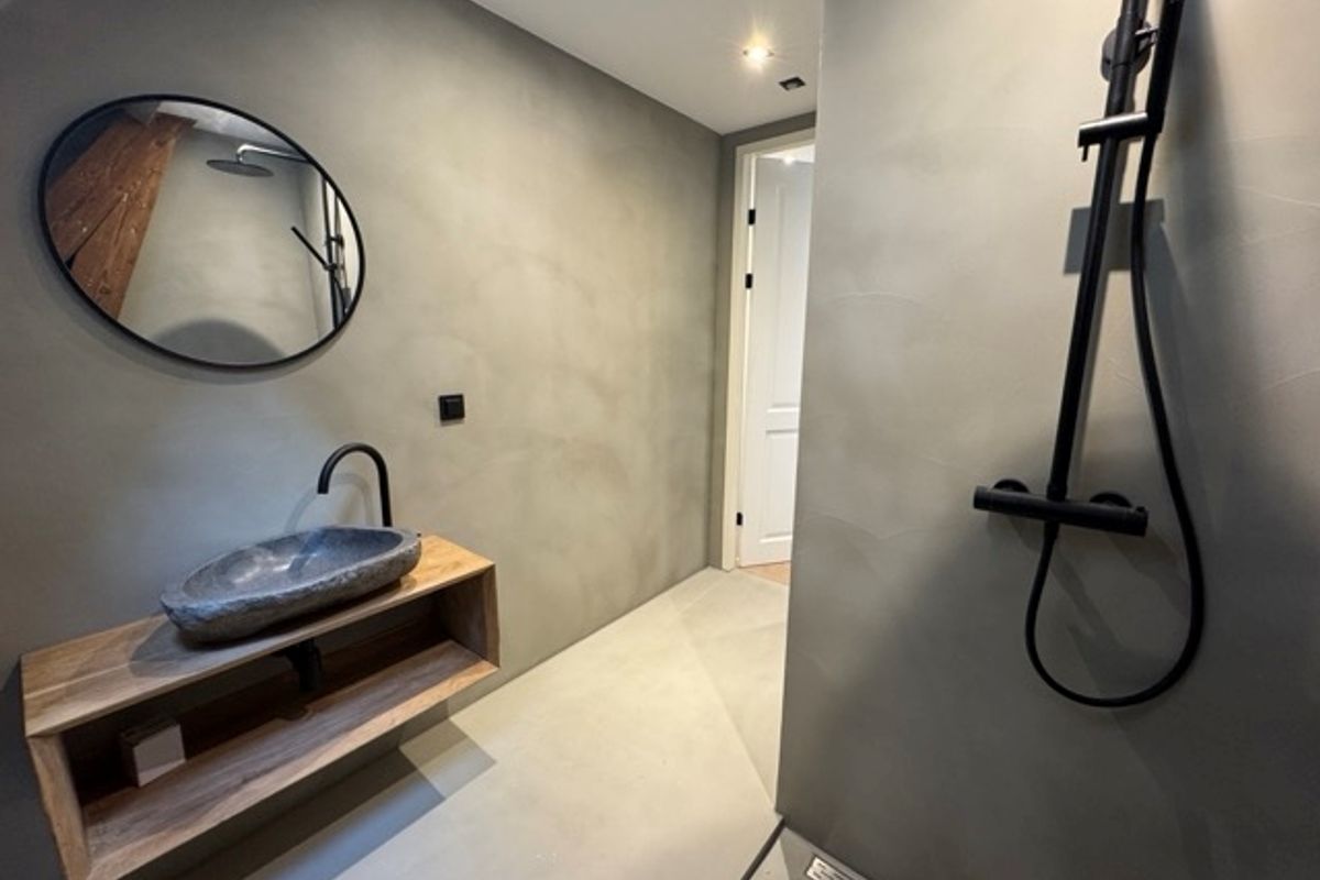 Naast de slaapkamerdeur bevindt zich de badkamer. Deze badkamer is voorzien van een inloopdouche, toilet en wastafel. De combinatie van zwarte kranen en een betonnen vloer geeft de ruimte een moderne en luxe uitstraling.