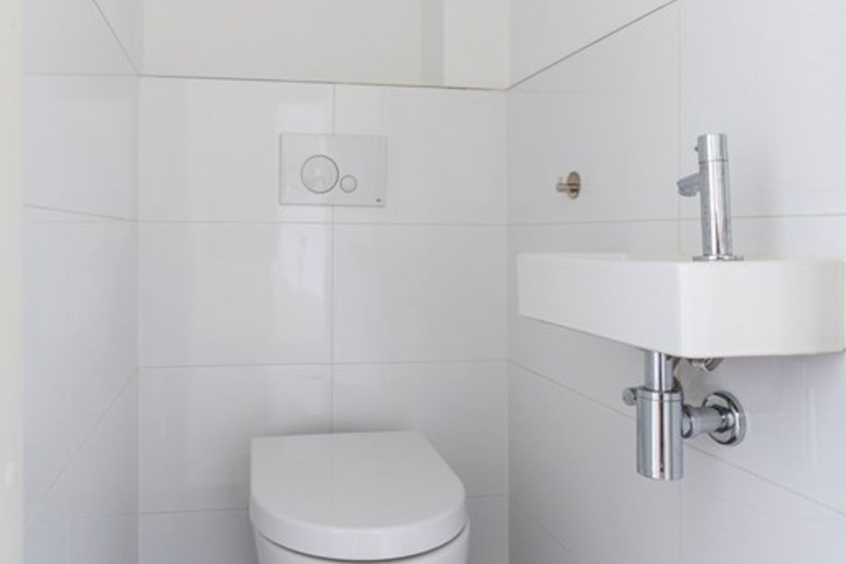 De badkamer beschikt over een inloopdouche en een wastafel. Het separate toilet met fontein is naast de badkamer gesitueerd.