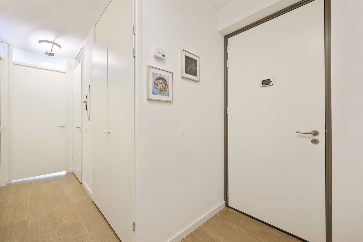 Met de lift bereiken we de zesde verdieping. Het ruime voorportaal geeft toegang naar de voordeur van de woning. In het voorportaal vindt je de meterkast. In het halletje van de woning bevindt zich aan de rechterkant de berging met de cv-installatie. Daarnaast tref je het zwevende toilet met fonteintje aan en de toegang tot de twee ruime slaapkamers. Beide slaapkamers hebben een mooie lichtinval en fraai uitzicht. Door de grote ramen tot aan de grond zijn dit lichte kamers. De draai ramen zijn voorzien van horren. Verderop in de hal is de badkamer te vinden. De badkamer is voorzien van een badmeubel met wastafel en spiegel en een ruime inloopdouche. Hier heeft men ook de aansluiting voor de wasmachine en droger.