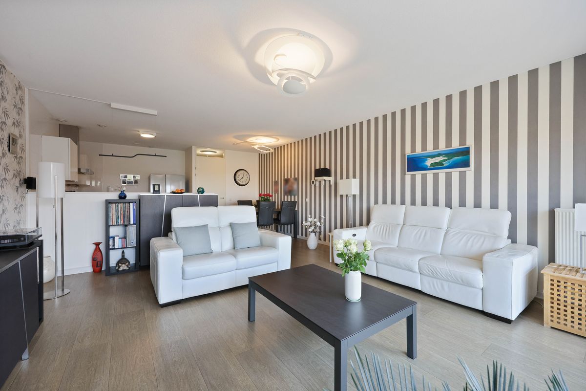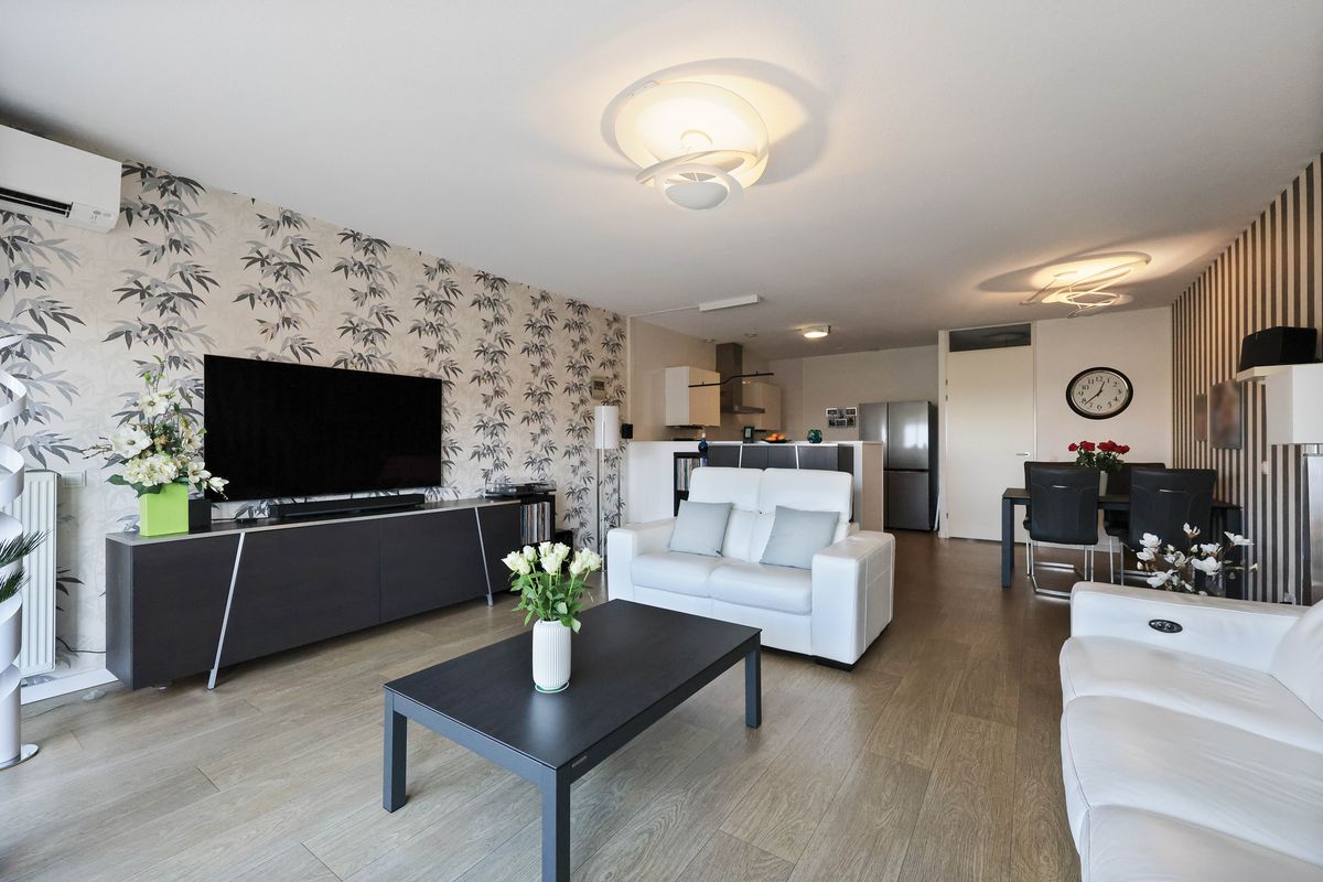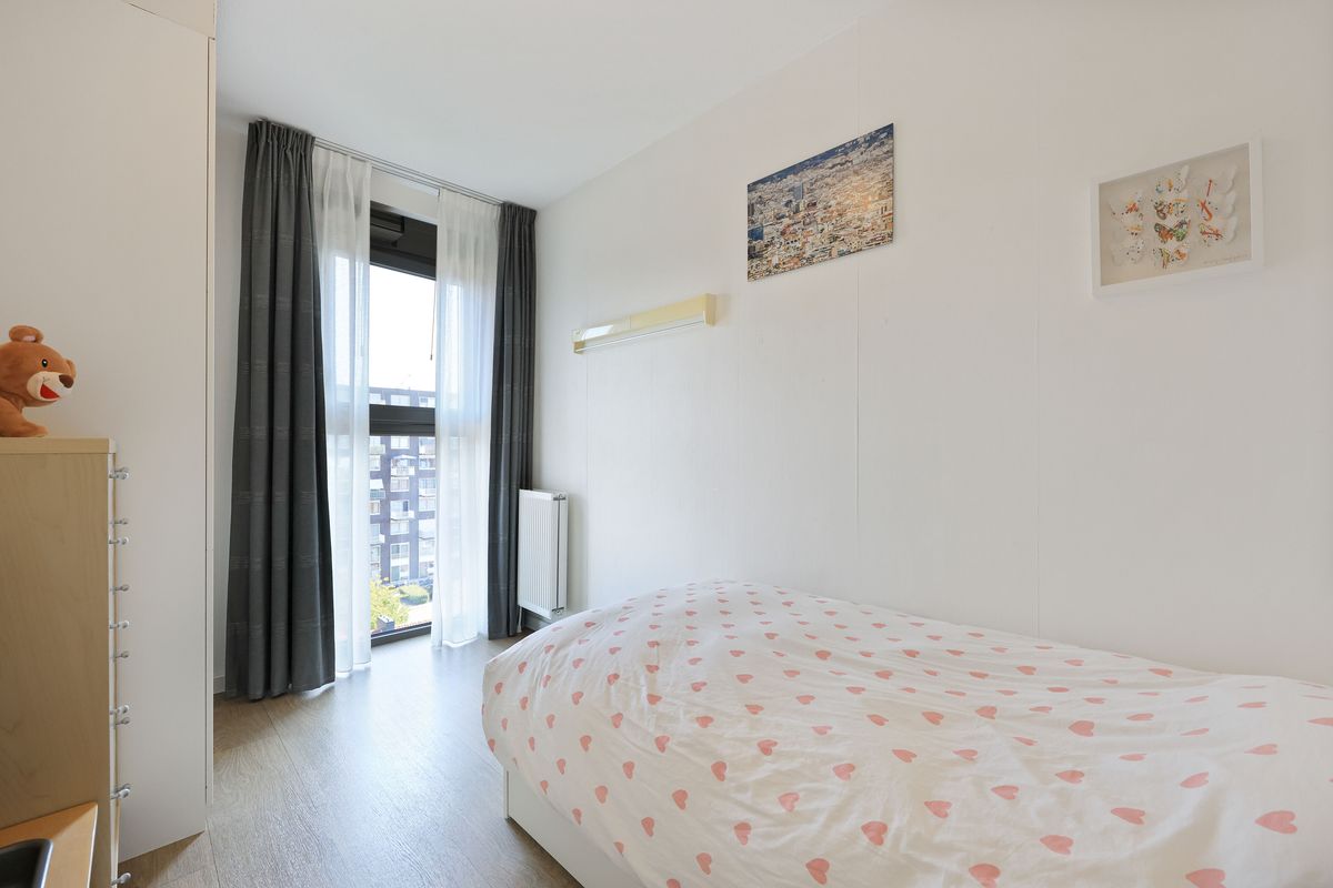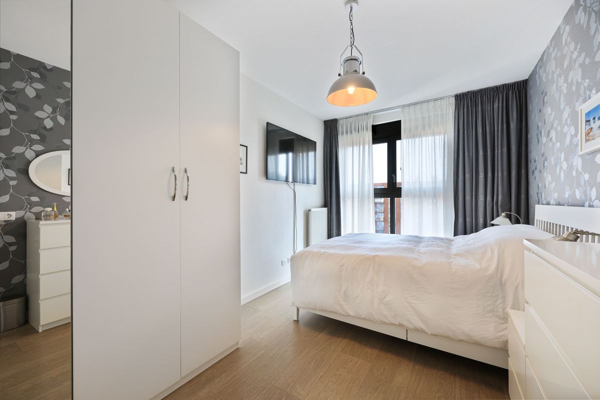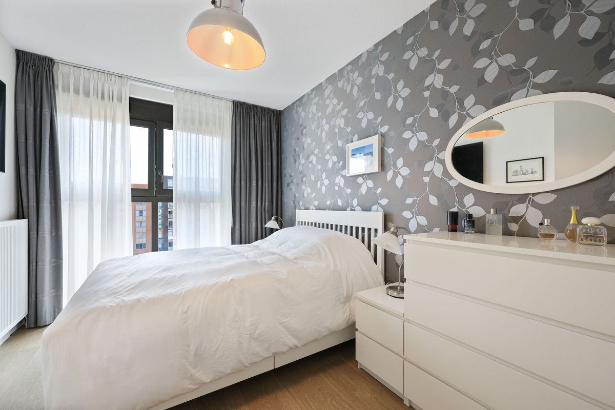 Dit ruime (85m2) fraaie appartement bevindt zich op de 6e verdieping van een verzorgd en modern appartementencomplex. De woonkamer met open keuken is een prachtige, lichte leefruimte dankzij de grote openslaande deuren en raampartijen. Het vrije uitzicht is geweldig; vanuit de woonkamer en beide slaapkamers.