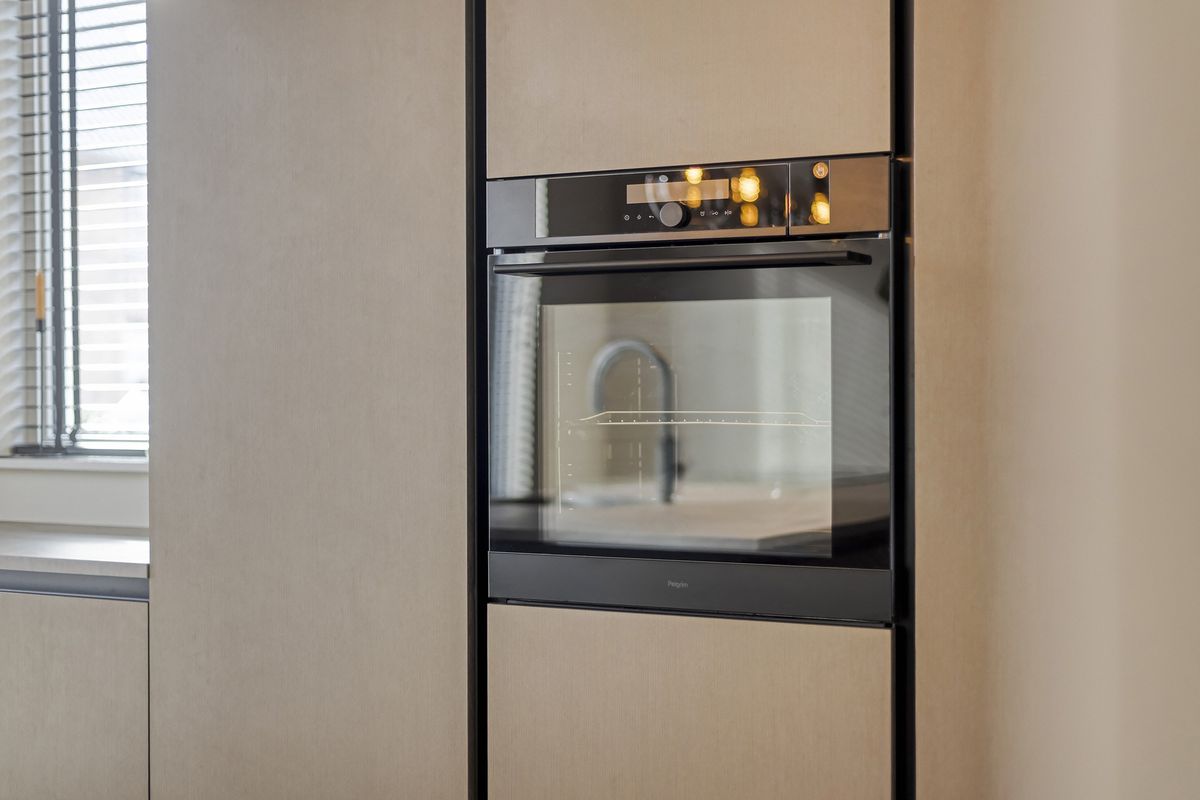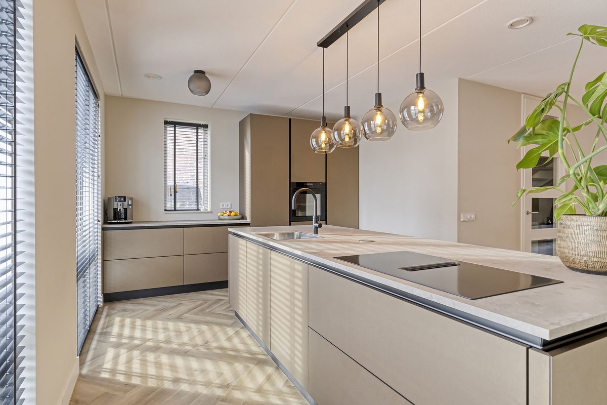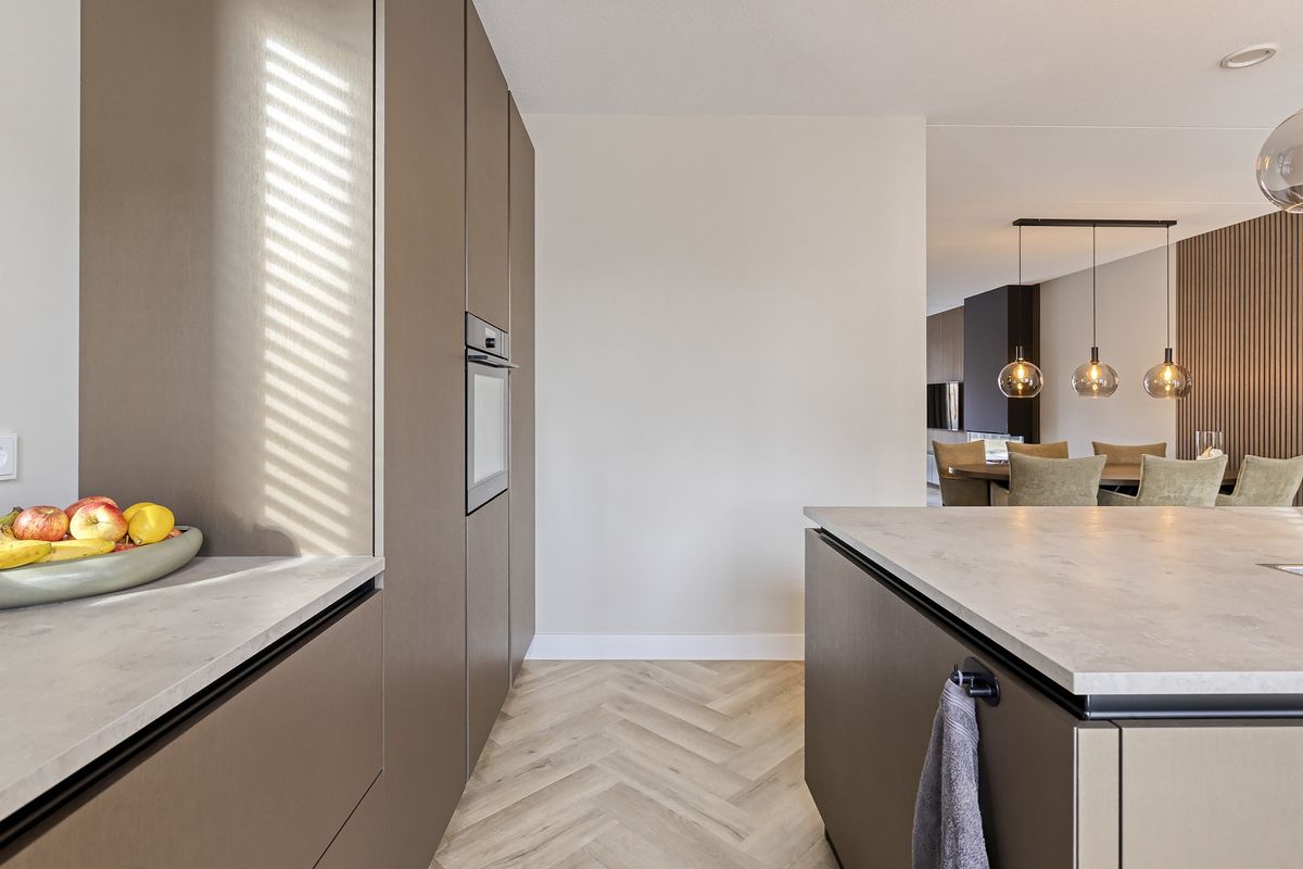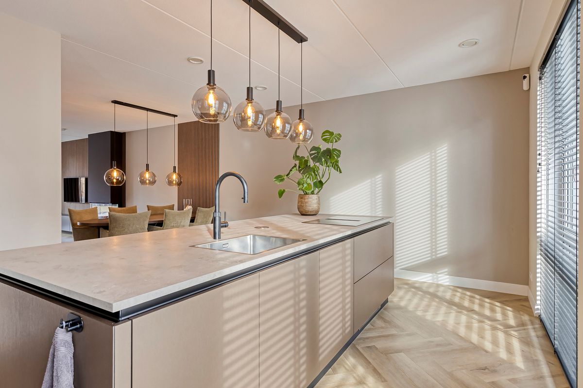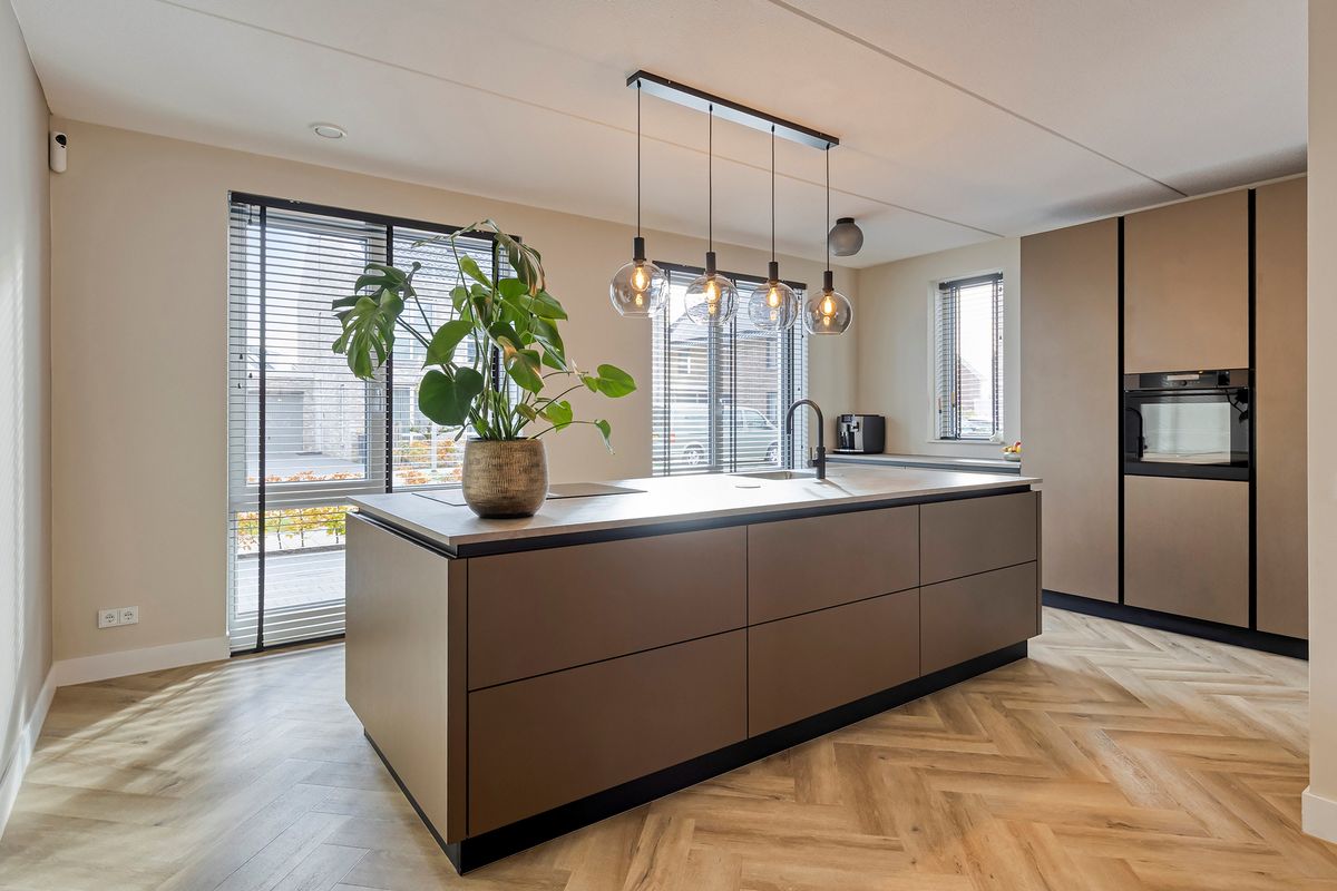 Je komt binnen in de ruime hal met garderobe, meterkast en een modern, zwevend toilet met fonteintje. Vanuit de hal stap je de uitgebouwde woonkamer in, een sfeervolle leefruimte met een elektrische haard met strak meubel en openslaande deuren naar het terras. De grote raampartijen aan zowel de voor- als achterzijde zorgen voor overvloedig daglicht en een fijne verbinding met buiten. Aan de voorzijde bevindt zich de luxe open keuken, uitgevoerd met een royaal kook- en spoeleiland. De inbouwapparatuur is van topniveau, waaronder een Quooker kraan en een kookplaat met geïntegreerde afzuiging. De visgraat PVC-vloer met vloerverwarming en topkoeling loopt drempelloos door over de hele begane grond en zorgt voor een moderne, warme uitstraling.