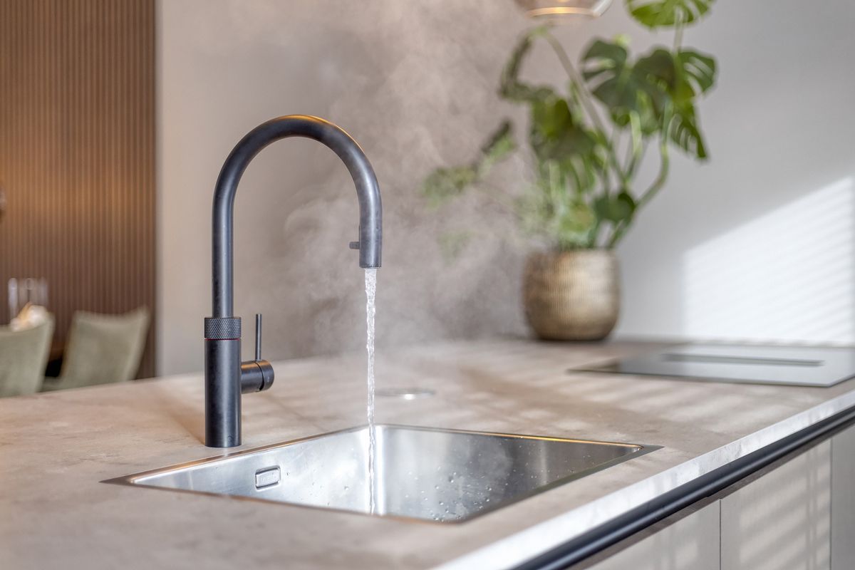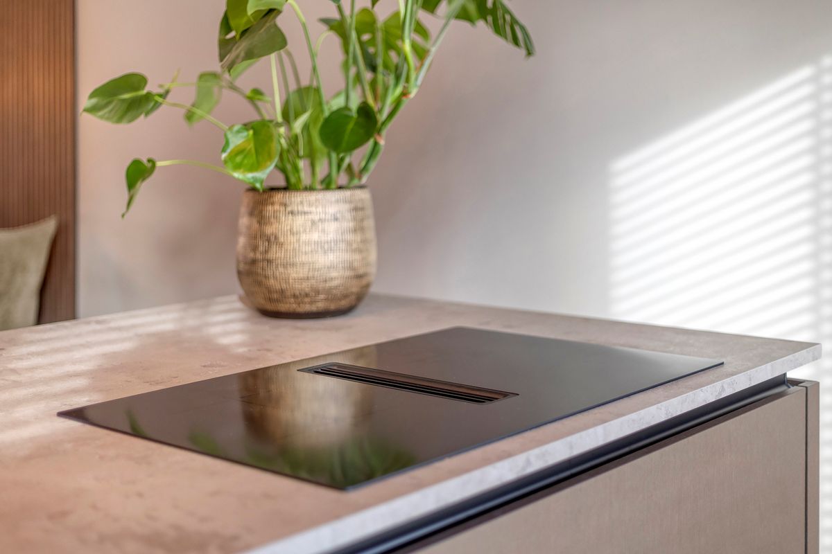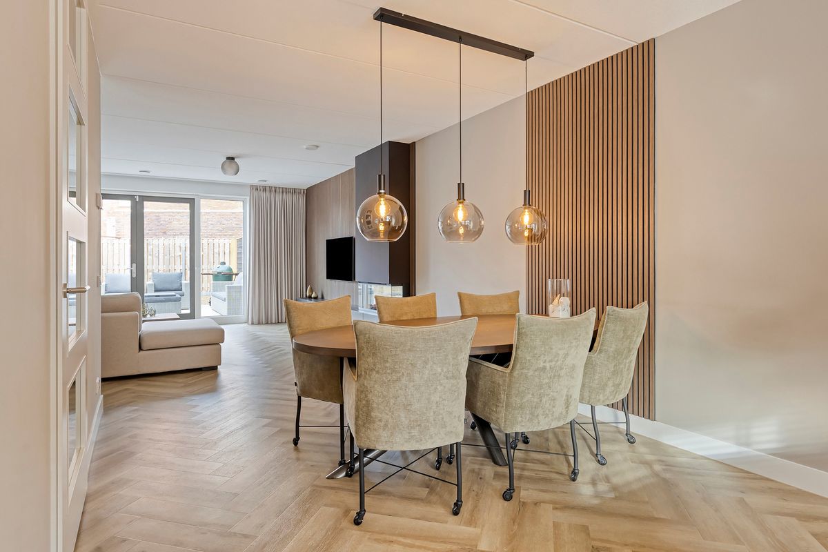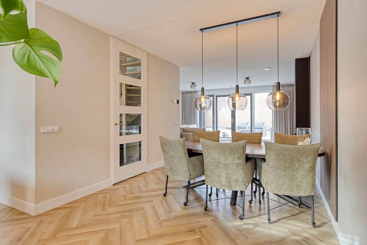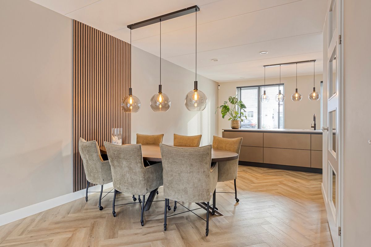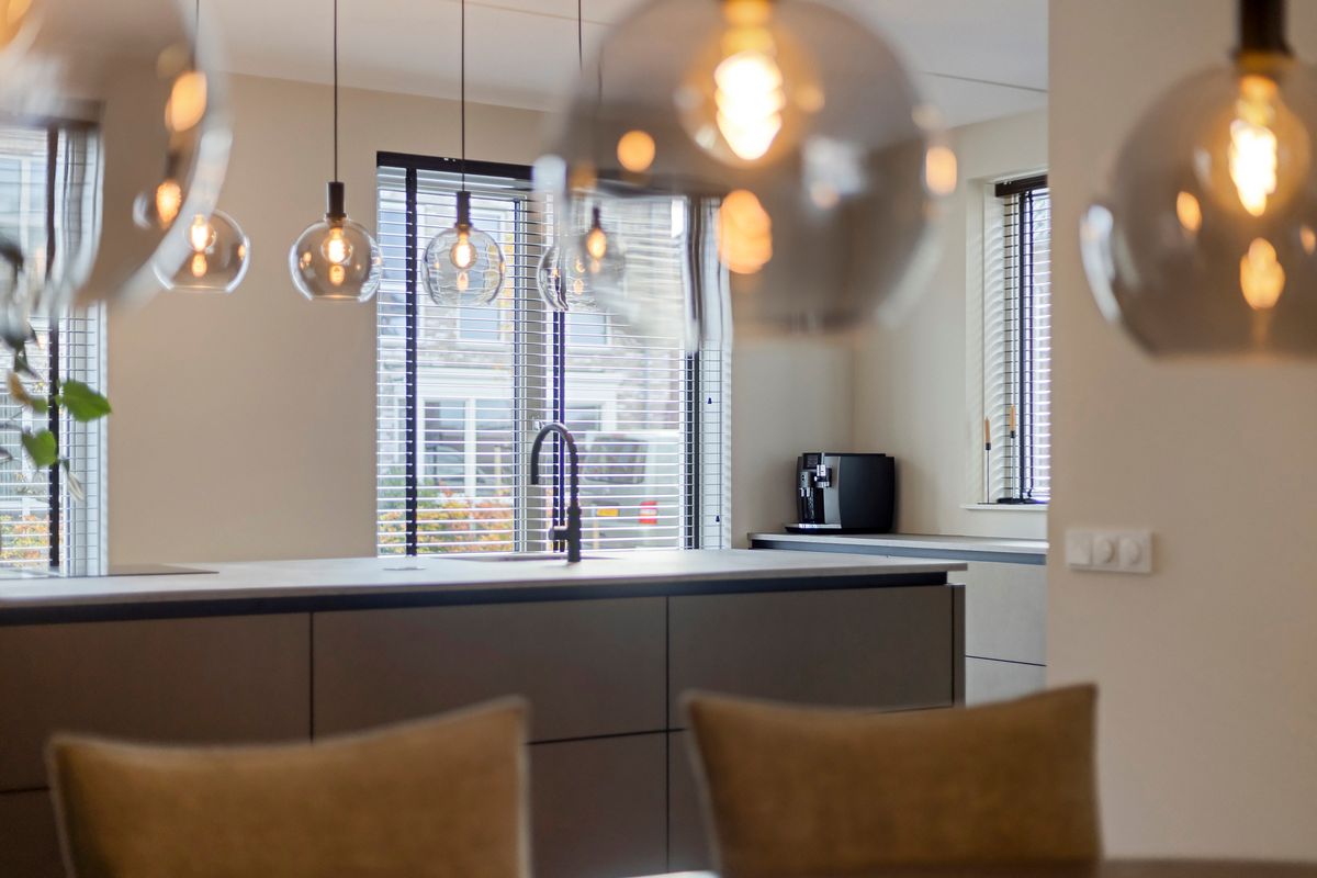 Je komt binnen in de ruime hal met garderobe, meterkast en een modern, zwevend toilet met fonteintje. Vanuit de hal stap je de uitgebouwde woonkamer in, een sfeervolle leefruimte met een elektrische haard met strak meubel en openslaande deuren naar het terras. De grote raampartijen aan zowel de voor- als achterzijde zorgen voor overvloedig daglicht en een fijne verbinding met buiten. Aan de voorzijde bevindt zich de luxe open keuken, uitgevoerd met een royaal kook- en spoeleiland. De inbouwapparatuur is van topniveau, waaronder een Quooker kraan en een kookplaat met geïntegreerde afzuiging. De visgraat PVC-vloer met vloerverwarming en topkoeling loopt drempelloos door over de hele begane grond en zorgt voor een moderne, warme uitstraling.