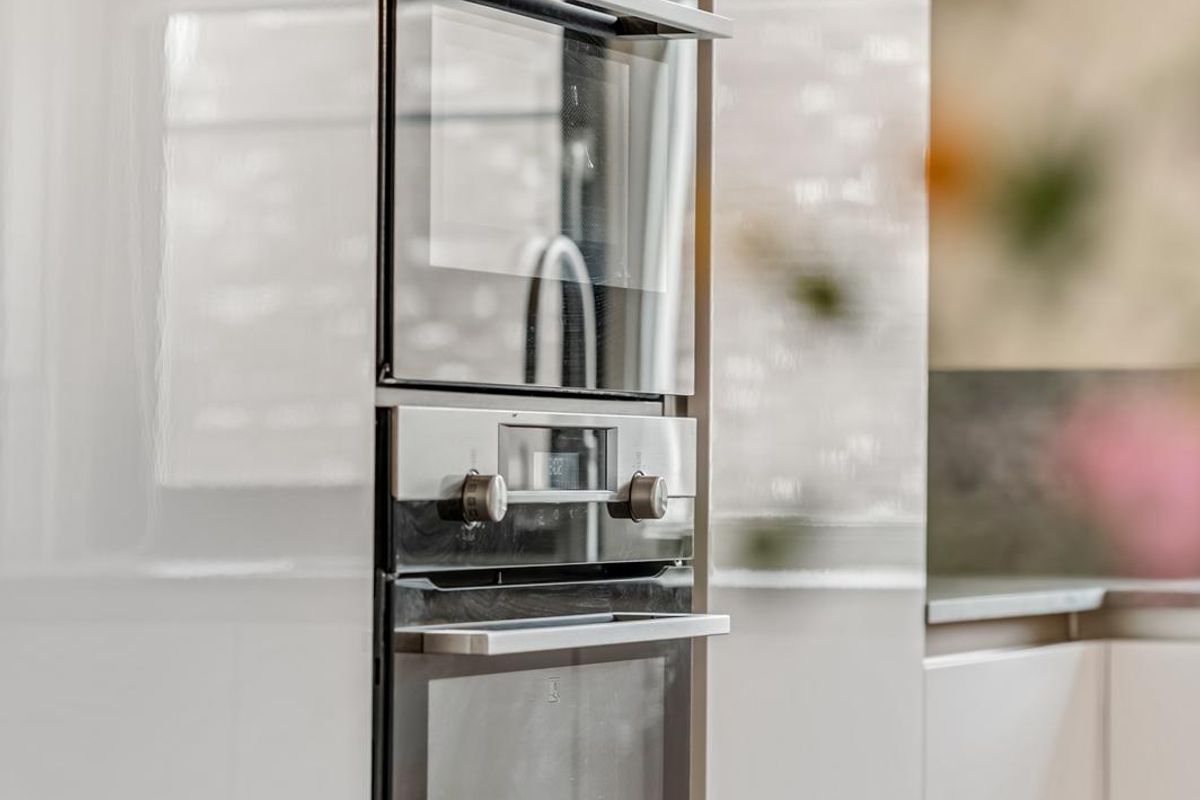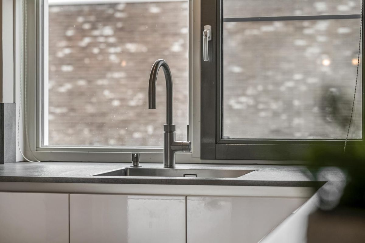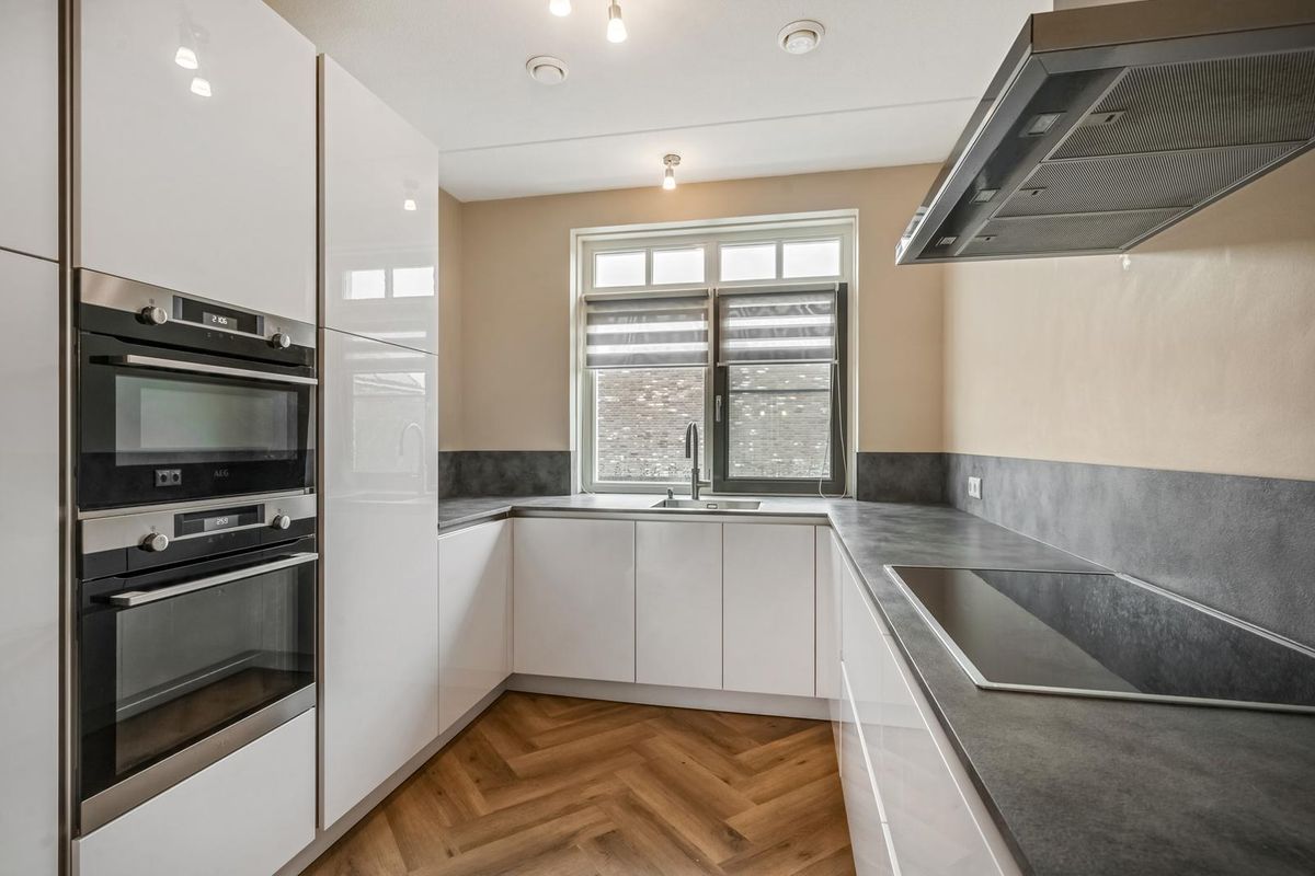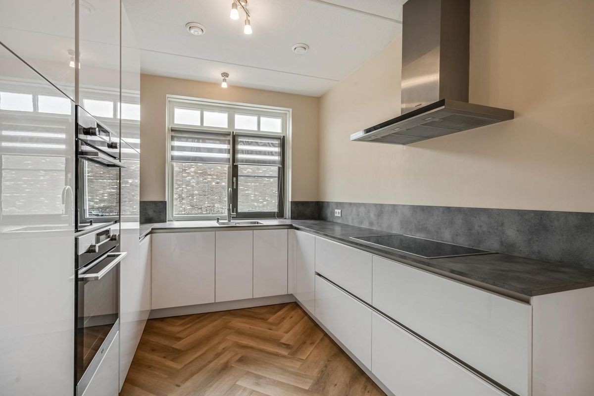 De strak vormgegeven keuken heeft een praktische U-opstelling met volop werk- en opbergruimte. Het grote raam zorgt voor prettig daglicht tijdens het koken en biedt uitzicht op de straat en het hofje met speeltuintje verderop. De keuken is uitgerust met kwalitatieve inbouwapparatuur, waaronder een Quooker, combi-oven, een oven en een inductiekookplaat met afzuigkap. Dankzij de lichte fronten en het donkere werkblad oogt de keuken modern en verzorgd.