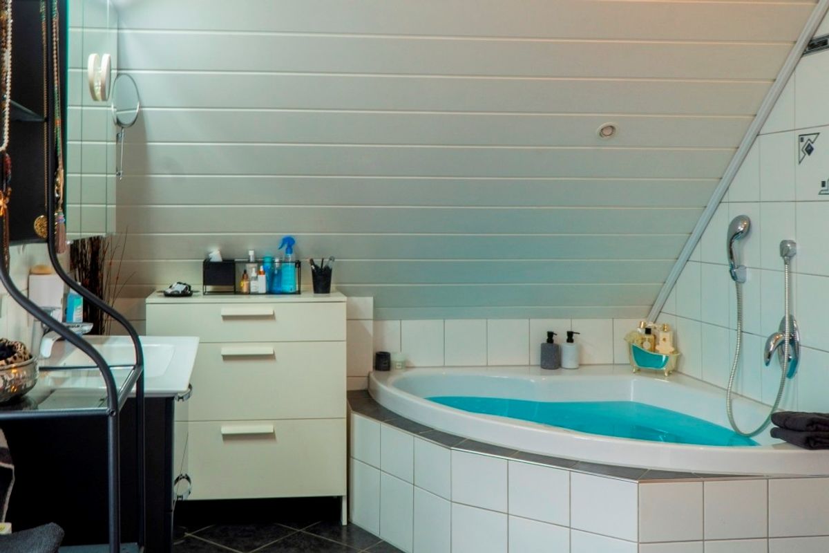 Hier bevinden zich drie lichte slaapkamers en een ruime badkamer met ligbad, douche, toilet en wastafel. De hoofdslaapkamer is voorzien van airconditioning, die zorgt voor een aangenaam klimaat in de gehele verdieping. De omgebouwde zolder biedt extra ruimte, bijvoorbeeld als hobby- of werkkamer.
