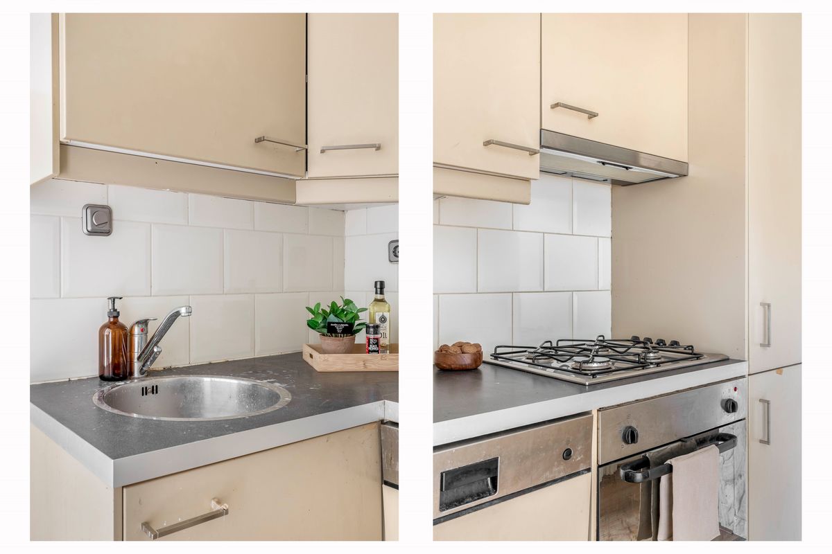 Keuken aan de achterzijde is voorzien van een keukenblok in hoekopstelling met gaskookplaat, afzuigkap, oven, vaatwasser en koel- vriescombinatie.