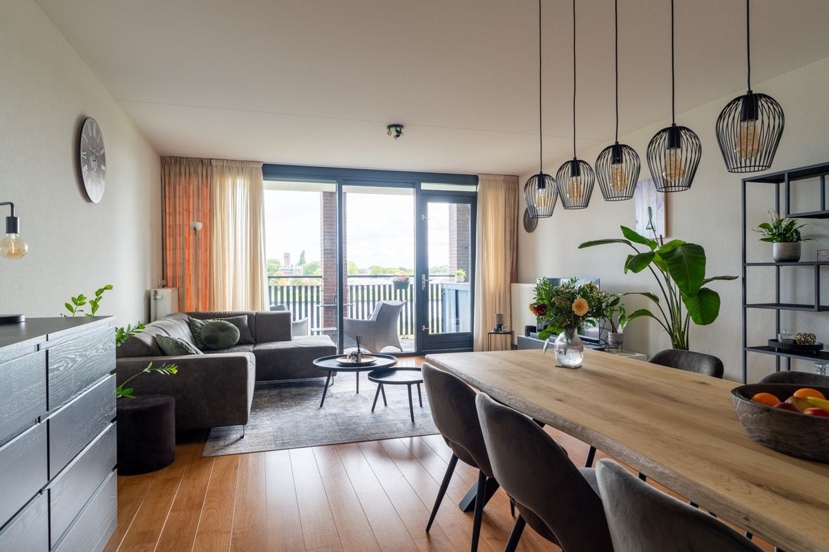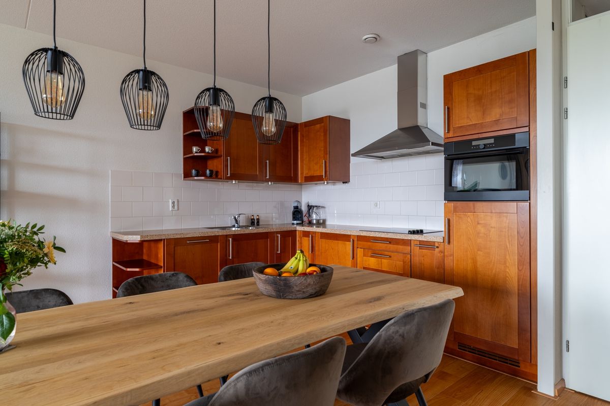 De woonkamer is licht en ruim dankzij de grote glazen pui die bijna de hele wand beslaat. Het uitzicht en de daglichtinval maken het een fijne plek om te wonen. Via de loopdeur heb je direct toegang tot het balkon, waar je heerlijk buiten kunt zitten. De keuken grenst direct aan de woonkamer en heeft een praktische hoekopstelling met diverse inbouwapparatuur, zoals een magnetron, koelkast, kookplaat, afzuigkap en vaatwasser. Zo kun je koken én tegelijk contact houden met gasten en gezin.