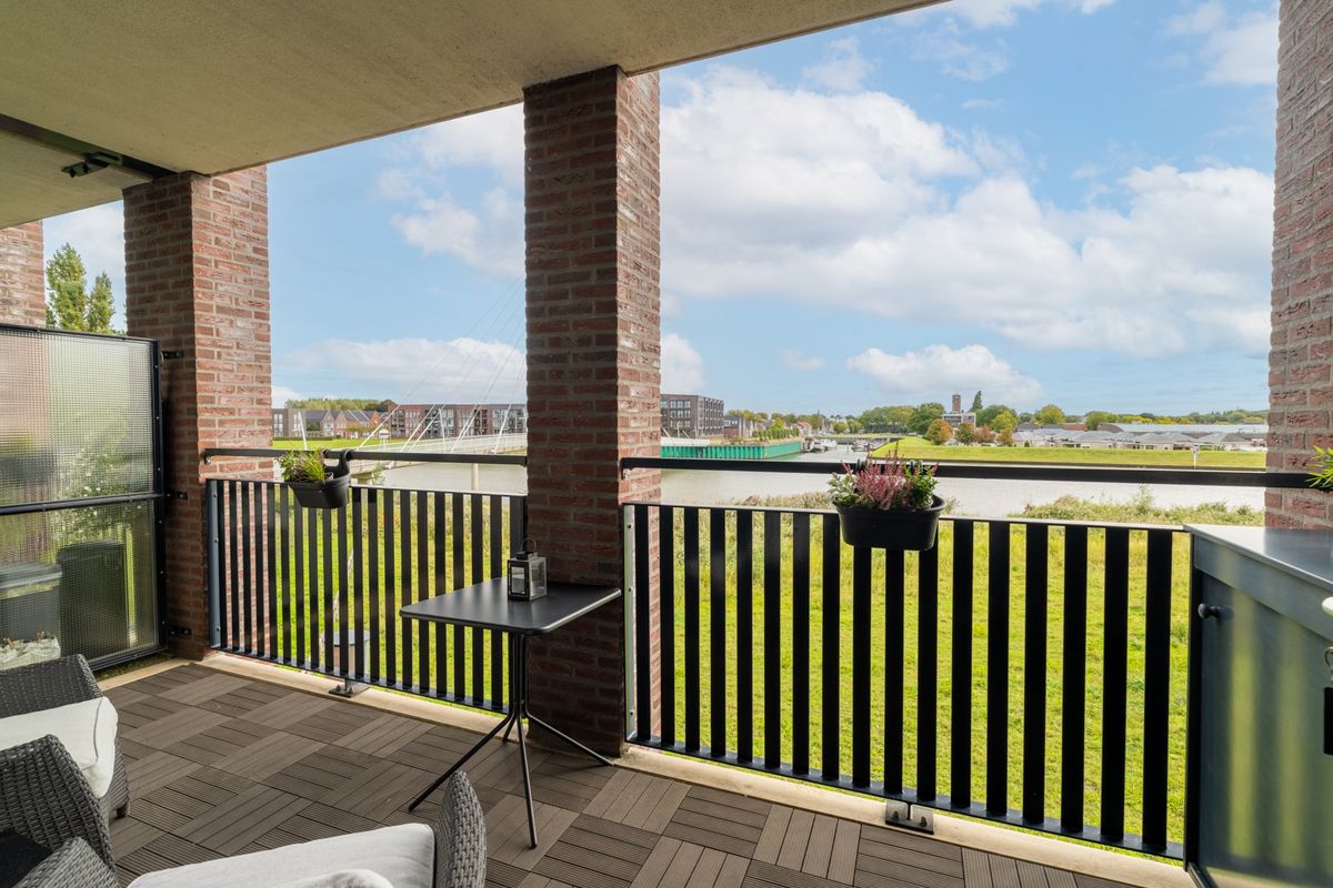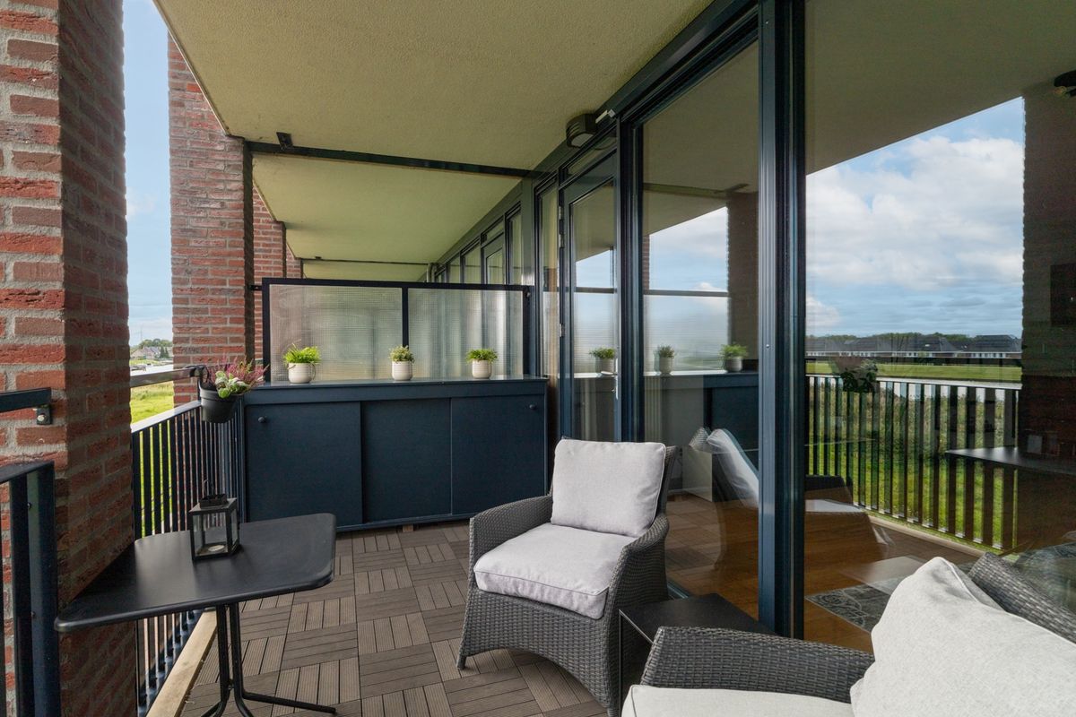 Het balkon (ca. 2.10 x 4.95 meter) is een fijne plek om te ontspannen, borrelen of gewoon te genieten van het uitzicht. De vloer is afgewerkt met onderhoudsvriendelijke vlondertegels in houtlook. In de woonkamer is een screen aanwezig, zodat je op warme dagen de zon lekker buiten houdt. In de vaste kast op het balkon berg je gemakkelijk kussens of accessoires op.