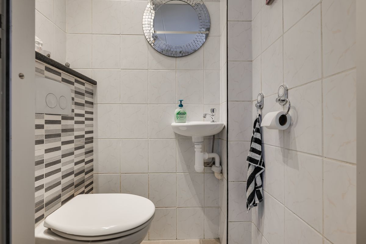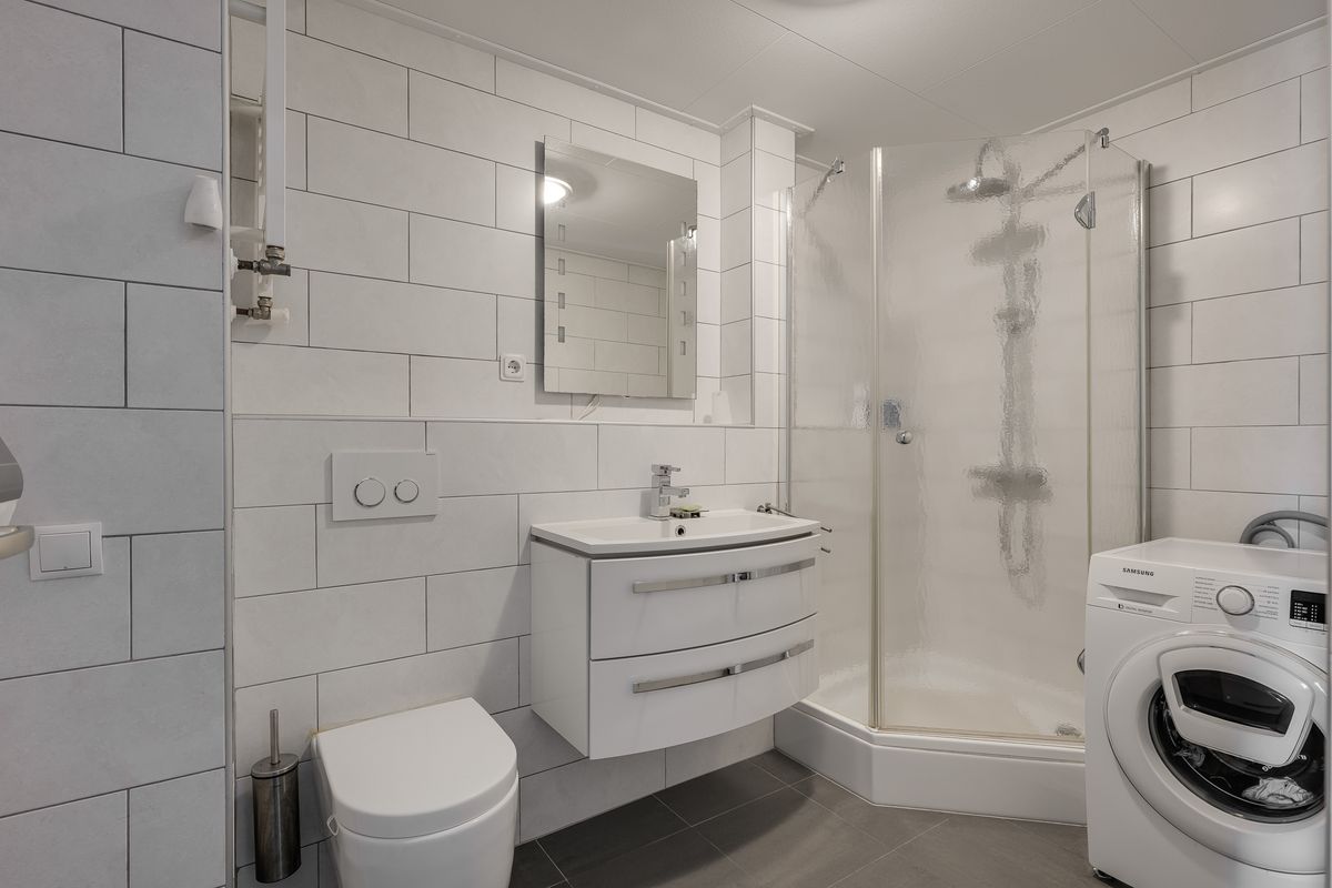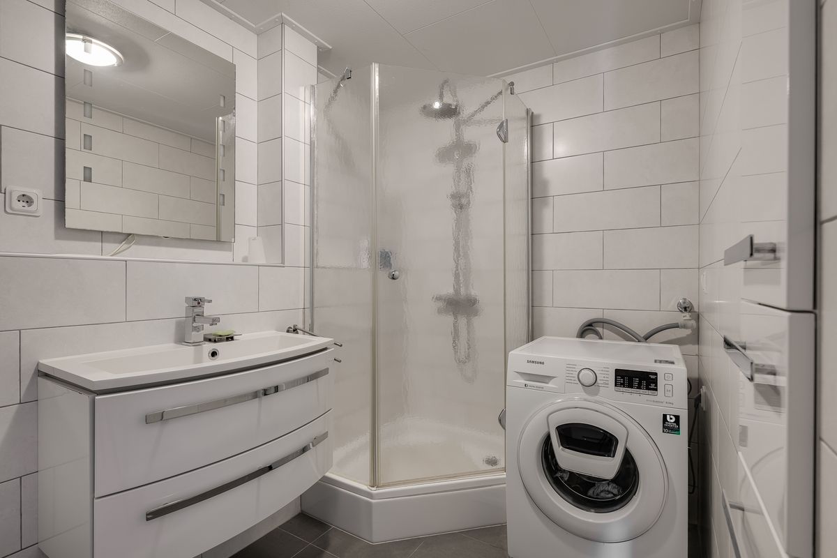 Op de eerste verdieping vind je twee slaapkamers, waaronder een ruime hoofdslaapkamer met balkon en uitzicht op het groen. De moderne badkamer is voorzien van een douche, wastafelmeubel, toilet en aansluiting voor de wasmachine.