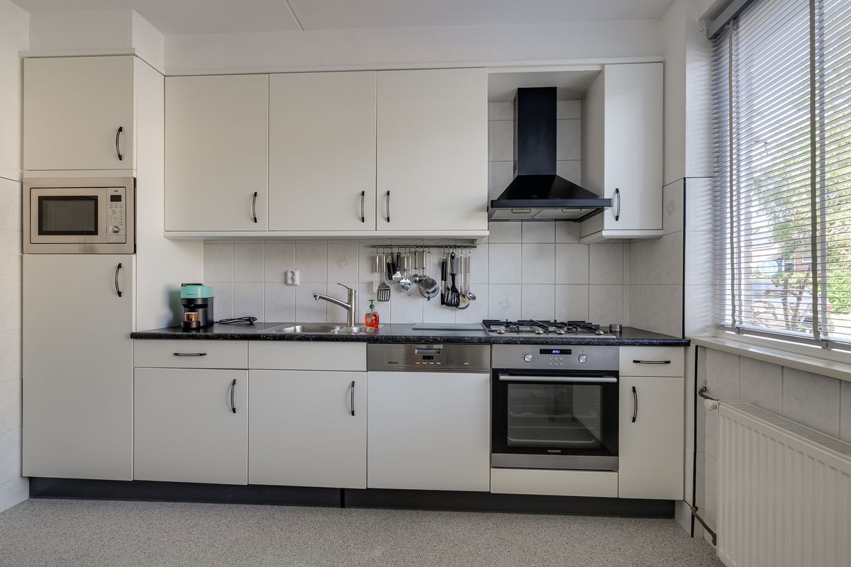 De keuken aan de voorzijde is functioneel en netjes, voorzien van inbouwapparatuur zoals een oven, kookplaat, afzuigkap, vaatwasser en magnetron.