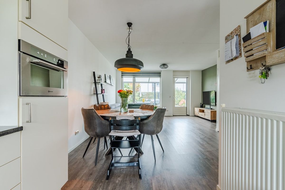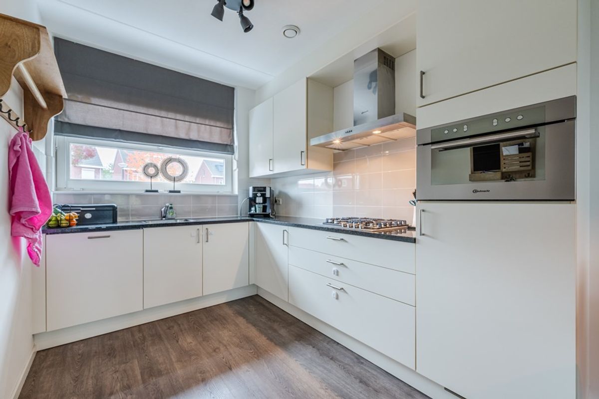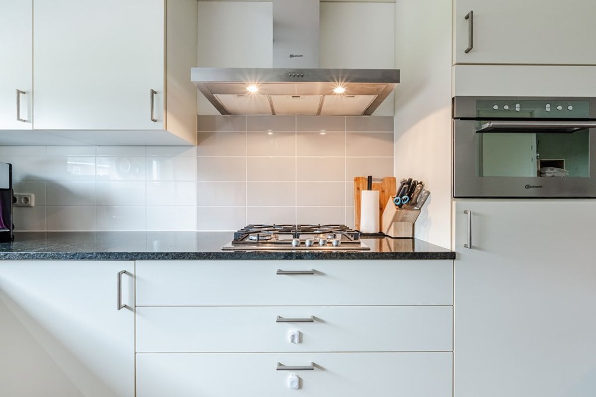 Aan de voorzijde ligt de moderne, open keuken (7 m²), voorzien van een gaskookplaat, afzuigkap, combimagnetron, vaatwasser en koelkast. Een ideale plek om te koken en gezellig samen te zijn. Vanuit de woonkamer is er toegang tot de tuin.