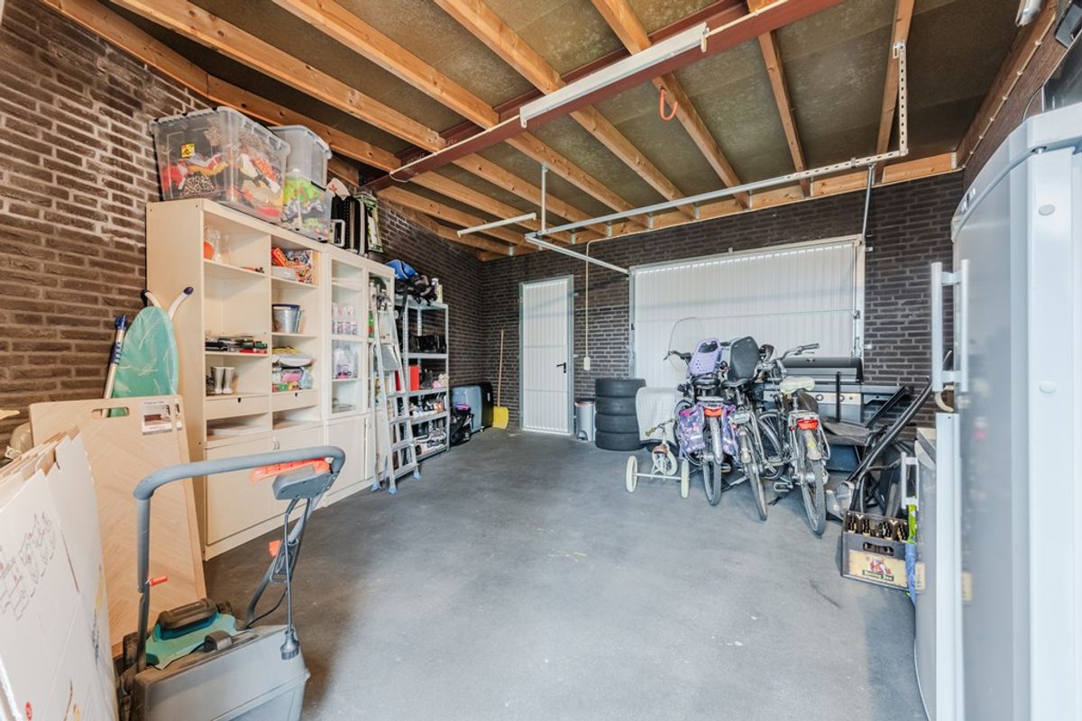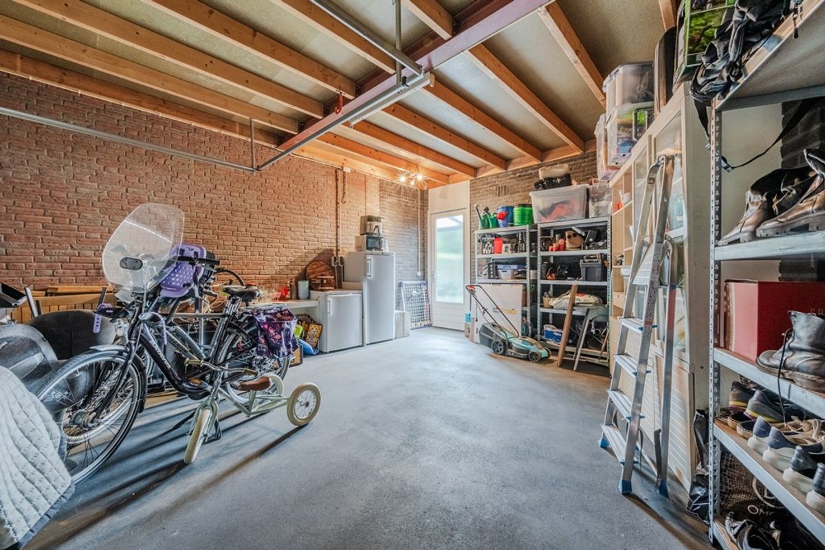 De ruime garage van circa 29 m² is voorzien van elektra en twee praktische deuren: één naar de tuin en één naar de oprit. De wateraansluiting bevindt zich aan de tuinzijde, onder de overkapping. Zo is de garage ook ideaal te gebruiken als werkruimte of berging. De brede oprit biedt plaats aan twee auto’s, comfortabel en praktisch.