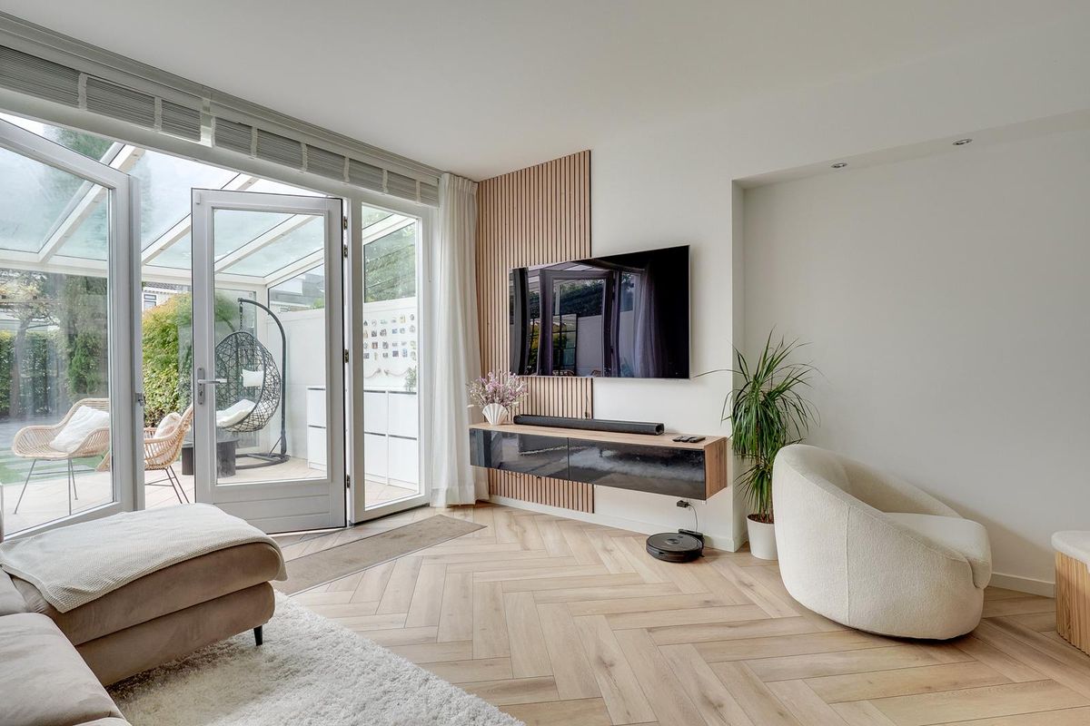 De lichte woonkamer met vloerverwarming vormt het hart van de woning. De grote raampartijen en dubbele deuren naar de tuin zorgen voor een heerlijke lichtinval.