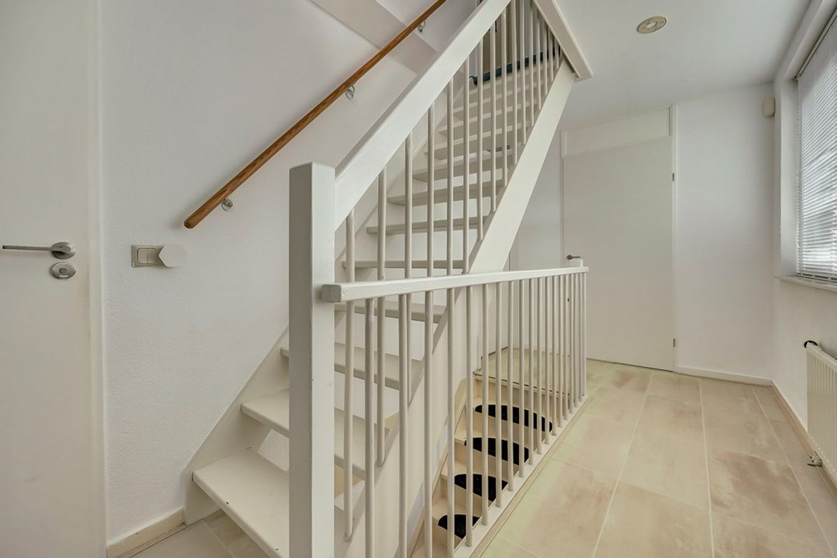Kom binnen in de riante en gezellige woonkamer. Prachtig zijn de hoge plafonds en de kamerhoge glazen pui, waardoor een overvloed aan daglicht de woning binnenstroomt en zorgt voor een ruimtelijke en lichte sfeer. Op de vloer ligt een laminaatvloer. De schuifpui zorgt voor een mooie verbinding met de tuin. Praktisch is de kast onder de trap waar je veel spulletjes kunt opbergen.