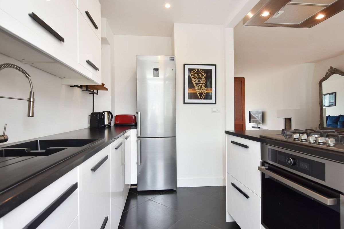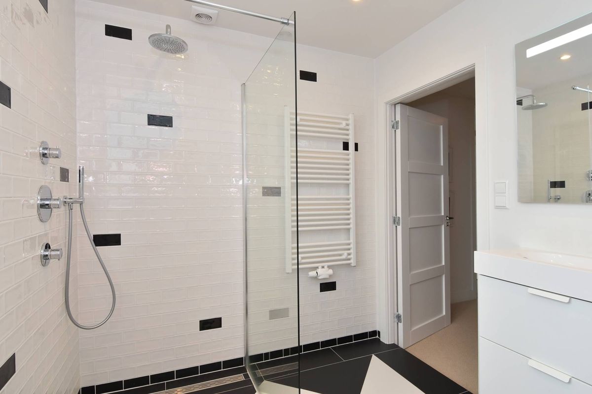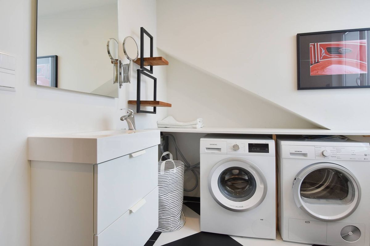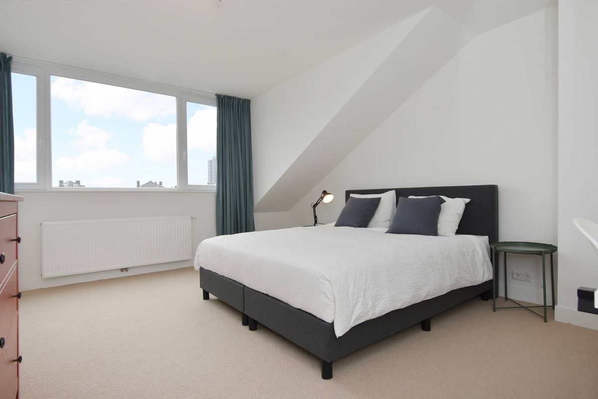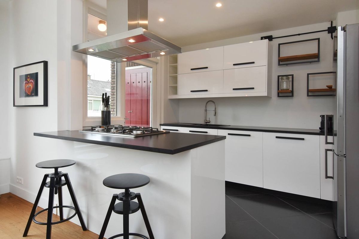 The spacious living room with oak wooden flooring provides plenty of natural light and has two fireplaces. The balcony runs the length of the property, facing southeast, and offers a view of the Hague skyline. The open-plan kitchen is equipped with all modern conveniences: a gas cooker and extractor hood, dishwasher, oven, and fridge-freezer. From the kitchen, you can access a small balcony with a storage cupboard and a view over Theresiastraat.