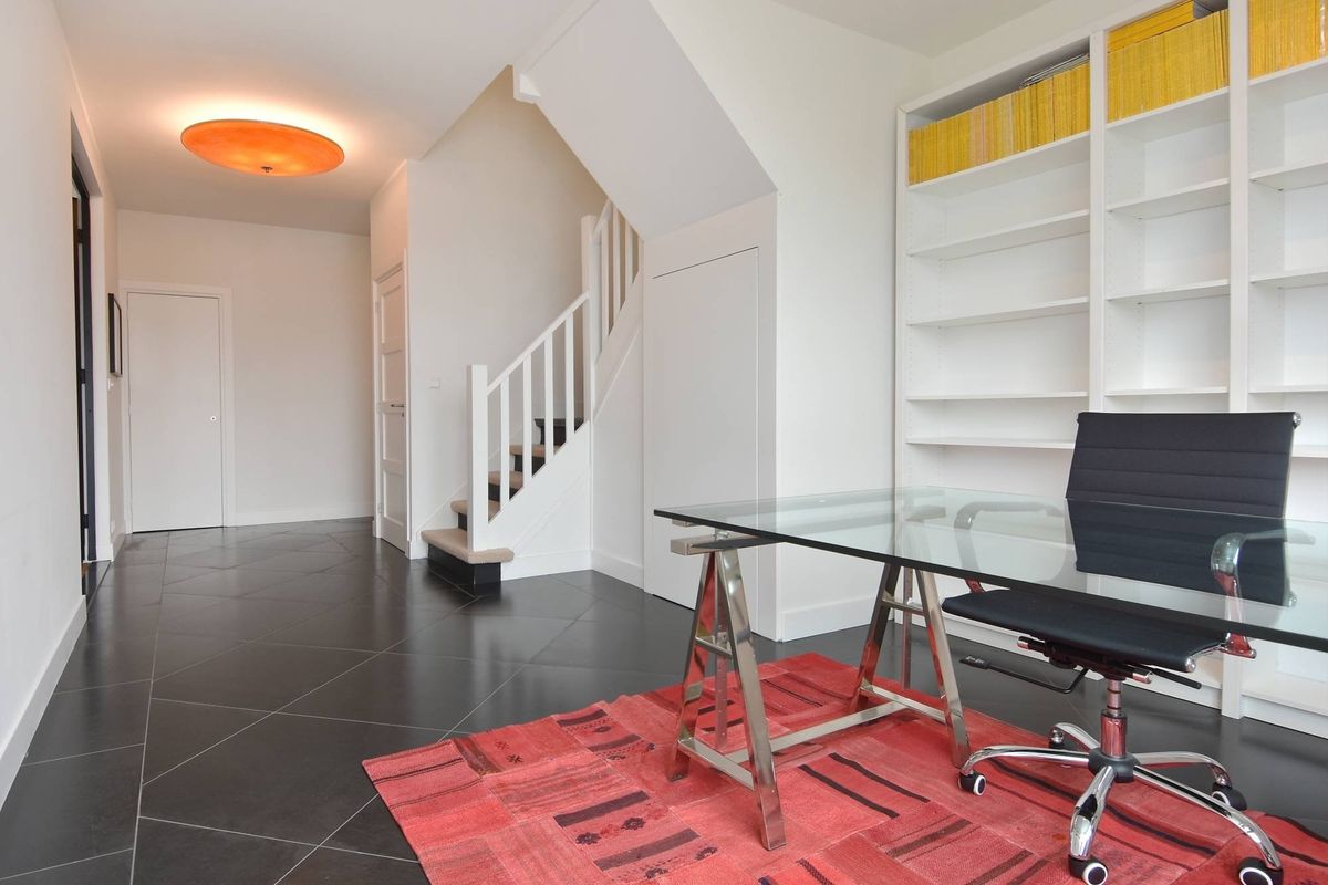 Closed entrance on street level, stairs to the second floor, and entrance to the apartment. The sizeable entrance hall provides access to the main living area with an open kitchen, an open-plan office/library area, a separate toilet, two storage cupboards, and stairs to the upper floor.