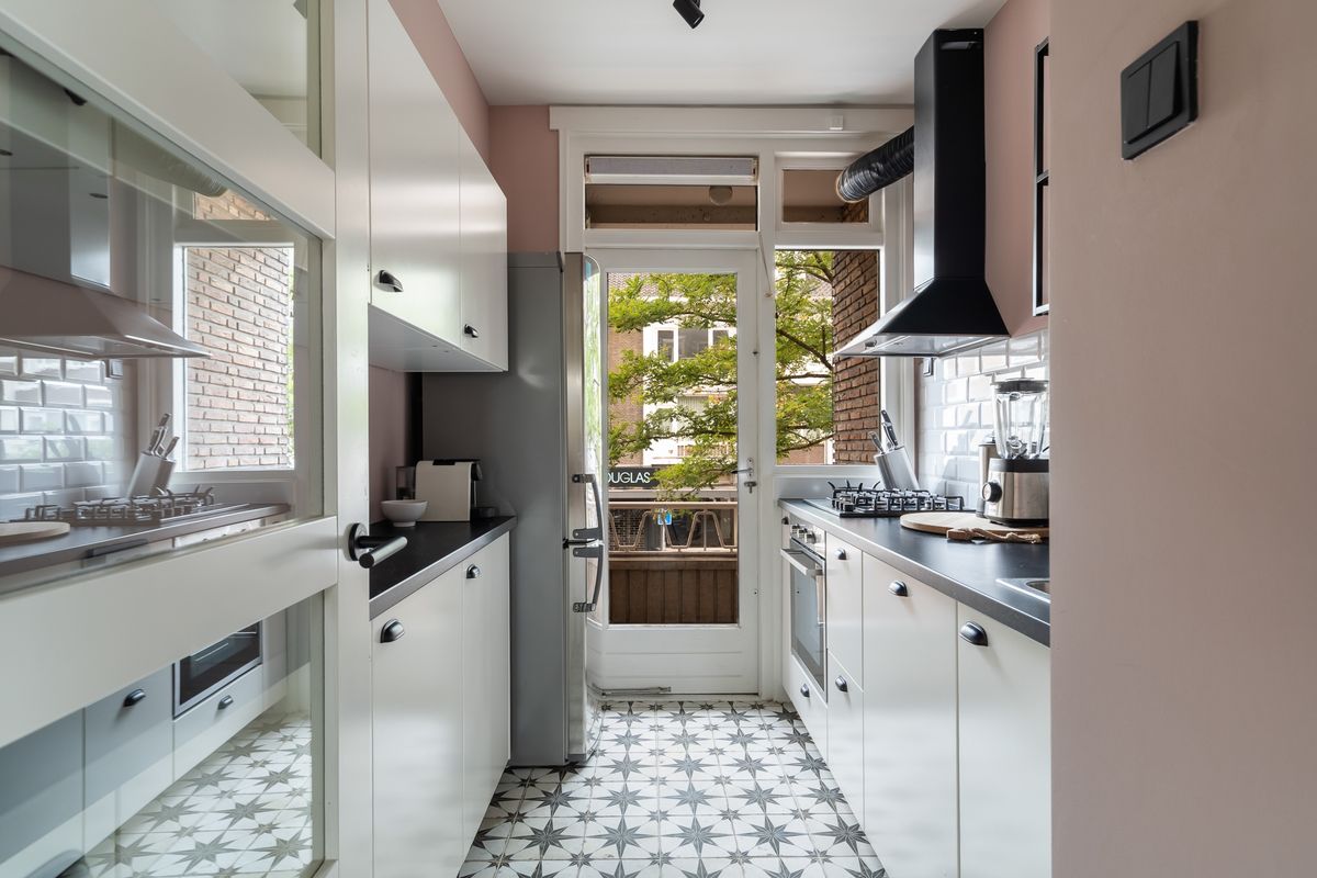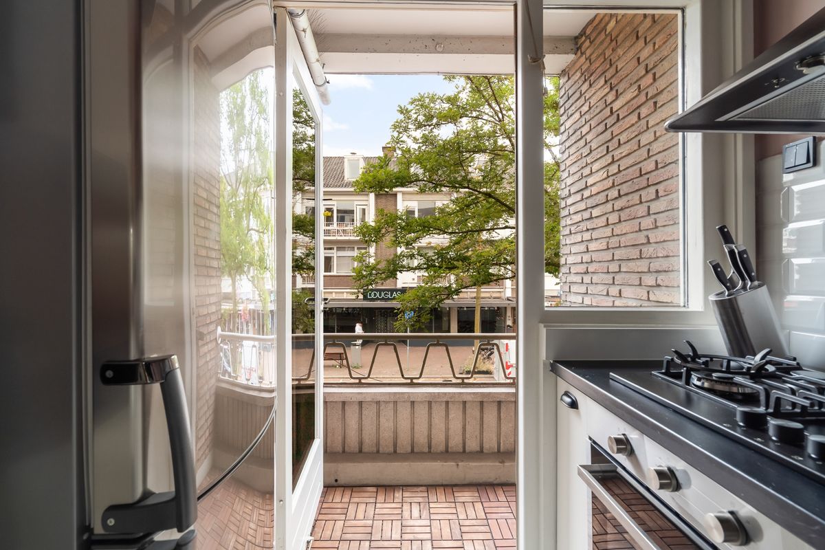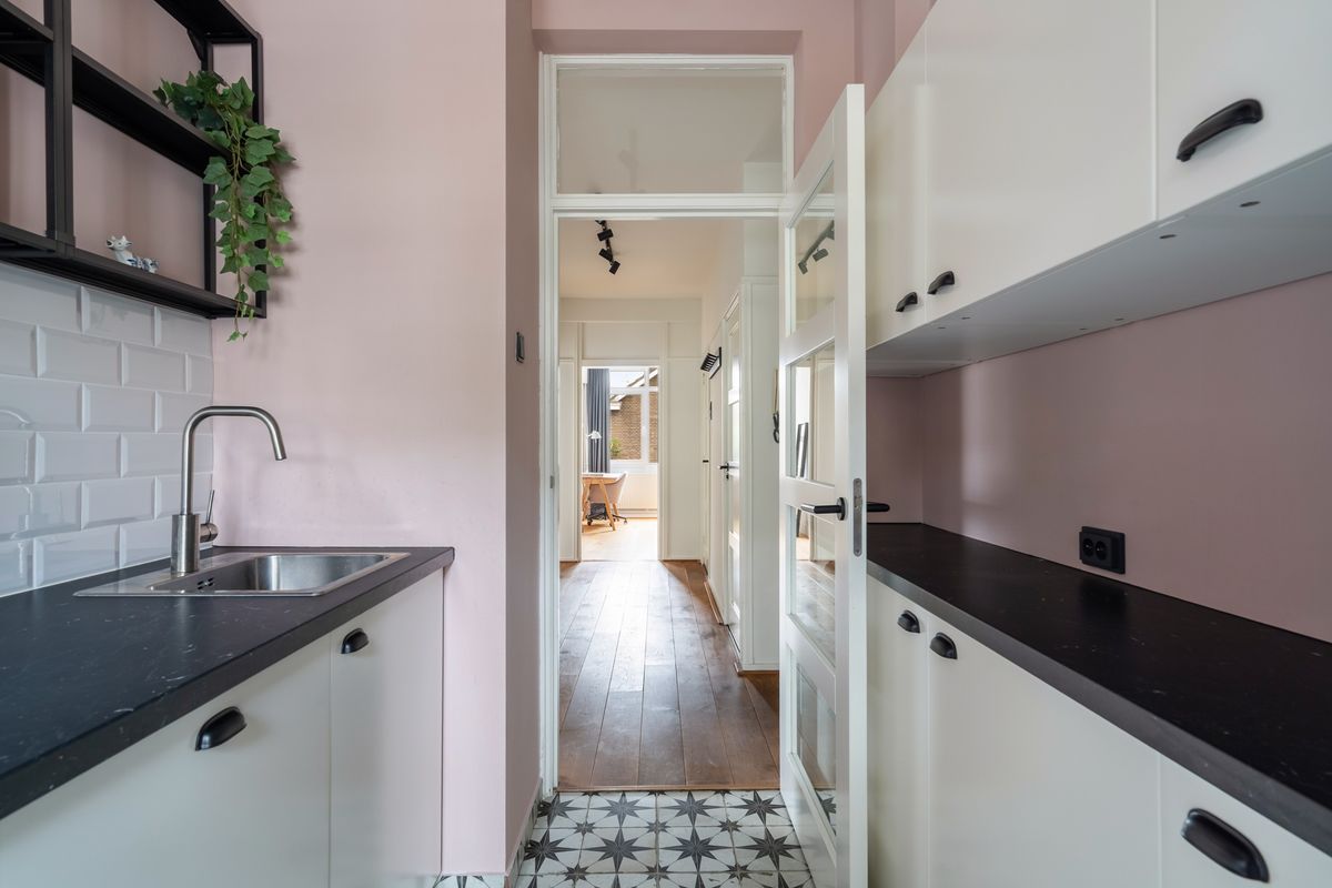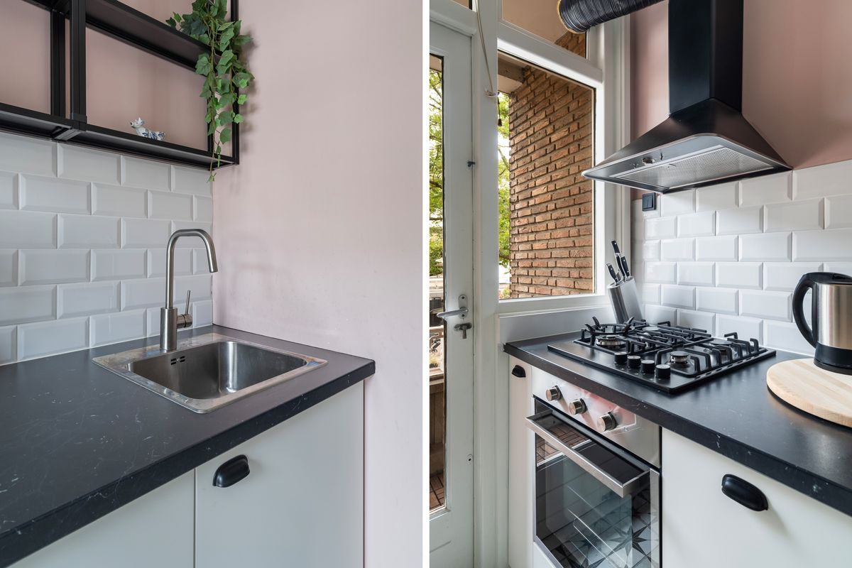 De moderne keuken is gerenoveerd in 2021 en bevindt zich eveneens aan de voorzijde van het appartement. Deze is voorzien van diverse inbouwapparatuur, zoals een vaatwasser en 4-pits gaskookplaat en een praktische indeling met voldoende werk- en opbergruimte. Vanuit de keuken stapt u zo een van de twee balkons op, waar u kunt genieten van het uitzicht over de straat.