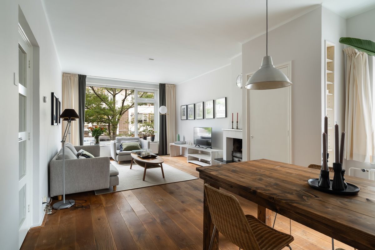 Aan de voorzijde bevindt zich de lichte woonkamer, met grote ramen die zorgen voor een prettige lichtinval en uitzicht bieden over de levendige Theresiastraat.