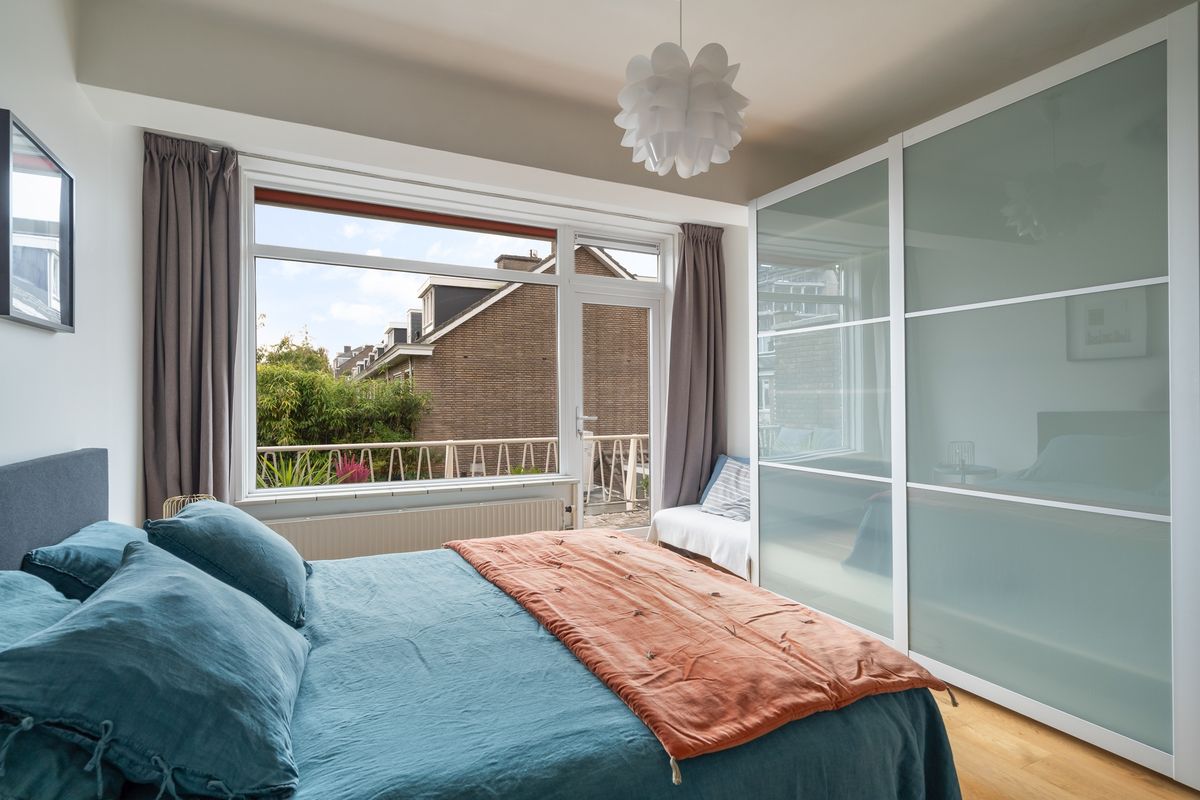 Aan de achterzijde ligt de rustige hoofdslaapkamer, met directe toegang tot het balkon met opbergkast, een fijne plek om te ontspannen in de ochtend- en middagzon. De tweede slaapkamer aan de achterzijde biedt eveneens voldoende ruimte en kan goed dienstdoen als slaapkamer, kinderkamer of thuiskantoor.