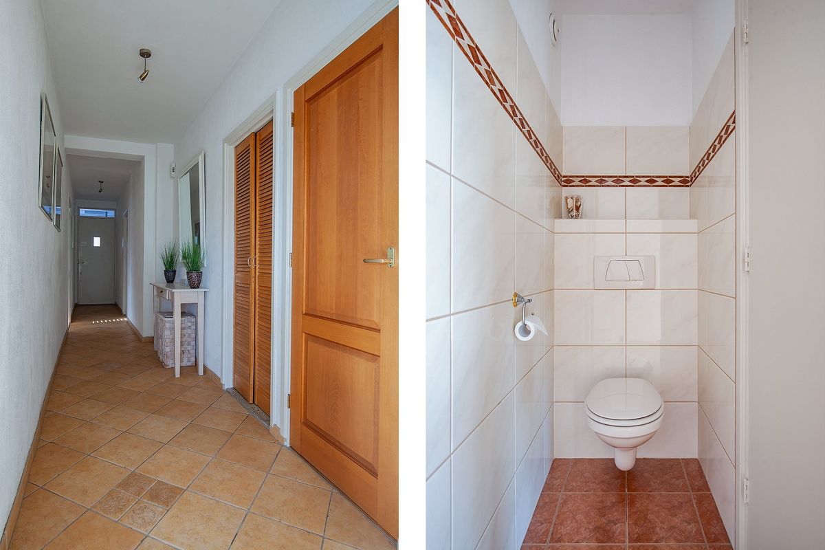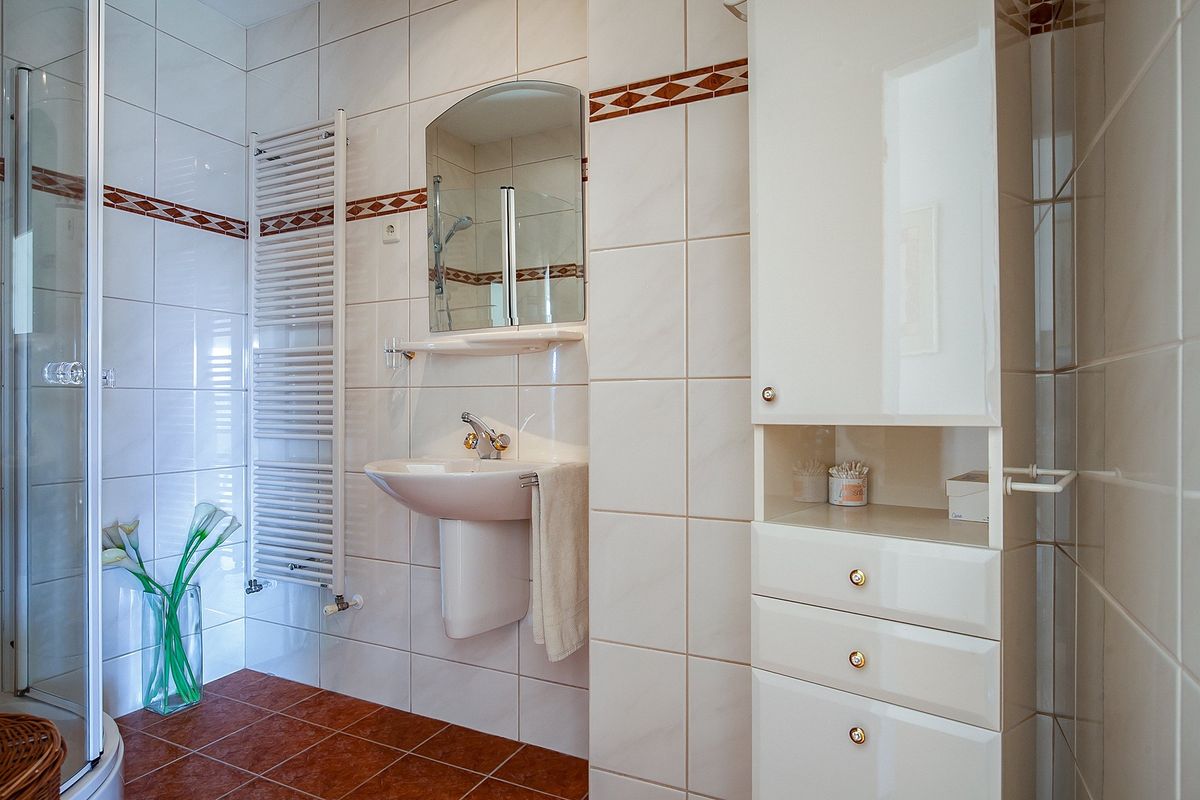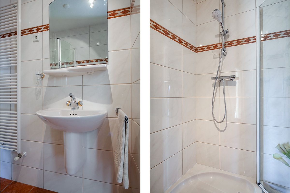 The bathroom (has been recently renovated, pictures are not up to date) is neatly finished and includes a shower, washbasin with mirror, and a towel radiator. A separate toilet is located in the hallway for added convenience.
