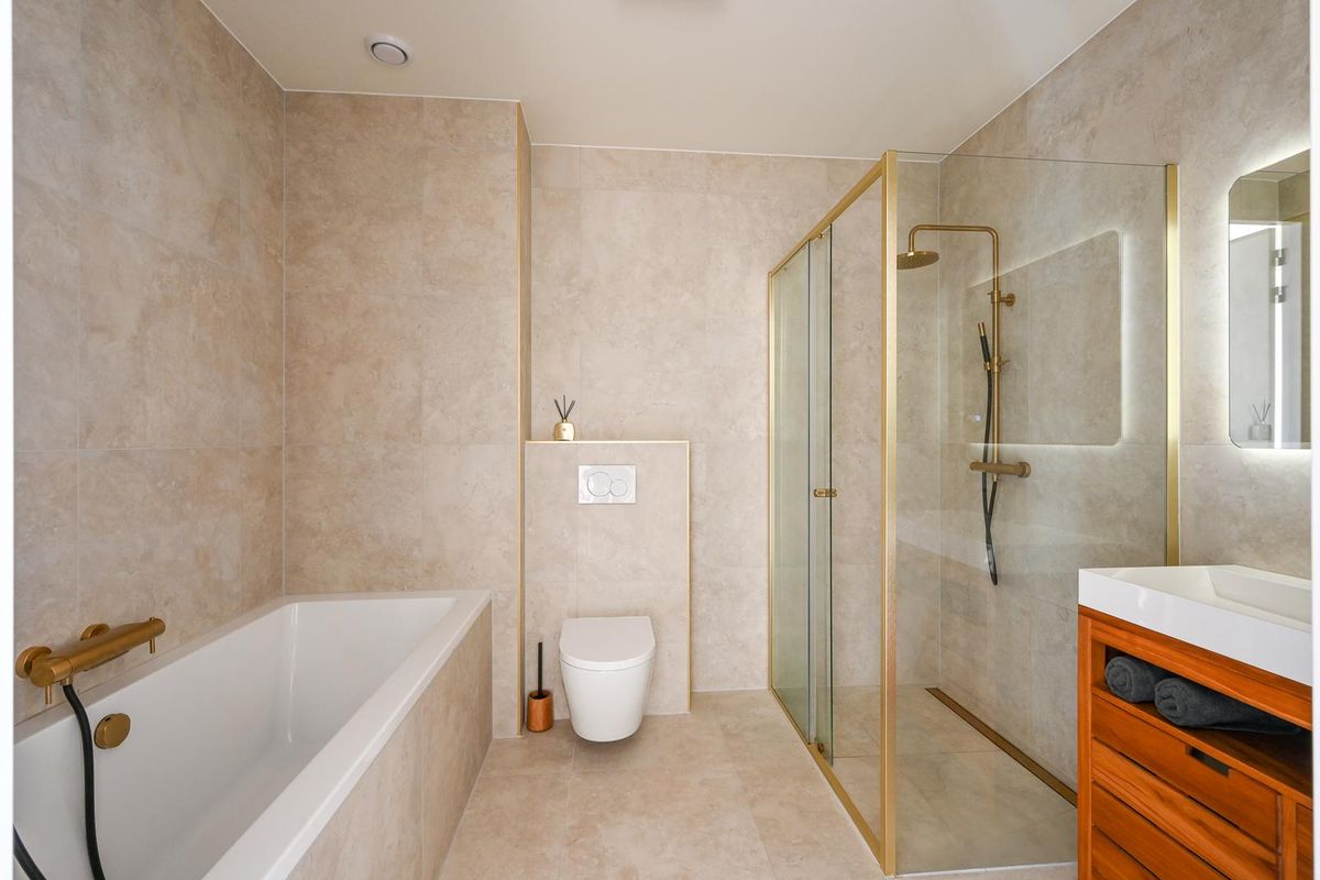 De moderne, volledig betegelde badkamer is uitgerust met alle gemakken en straalt een luxe hotelgevoel uit. U vindt hier een royaal ligbad, een inloopdouche met regen- en handdouche, een stijlvol wastafelmeubel en een modern tweede toilet met hangcloset en inbouwreservoir.