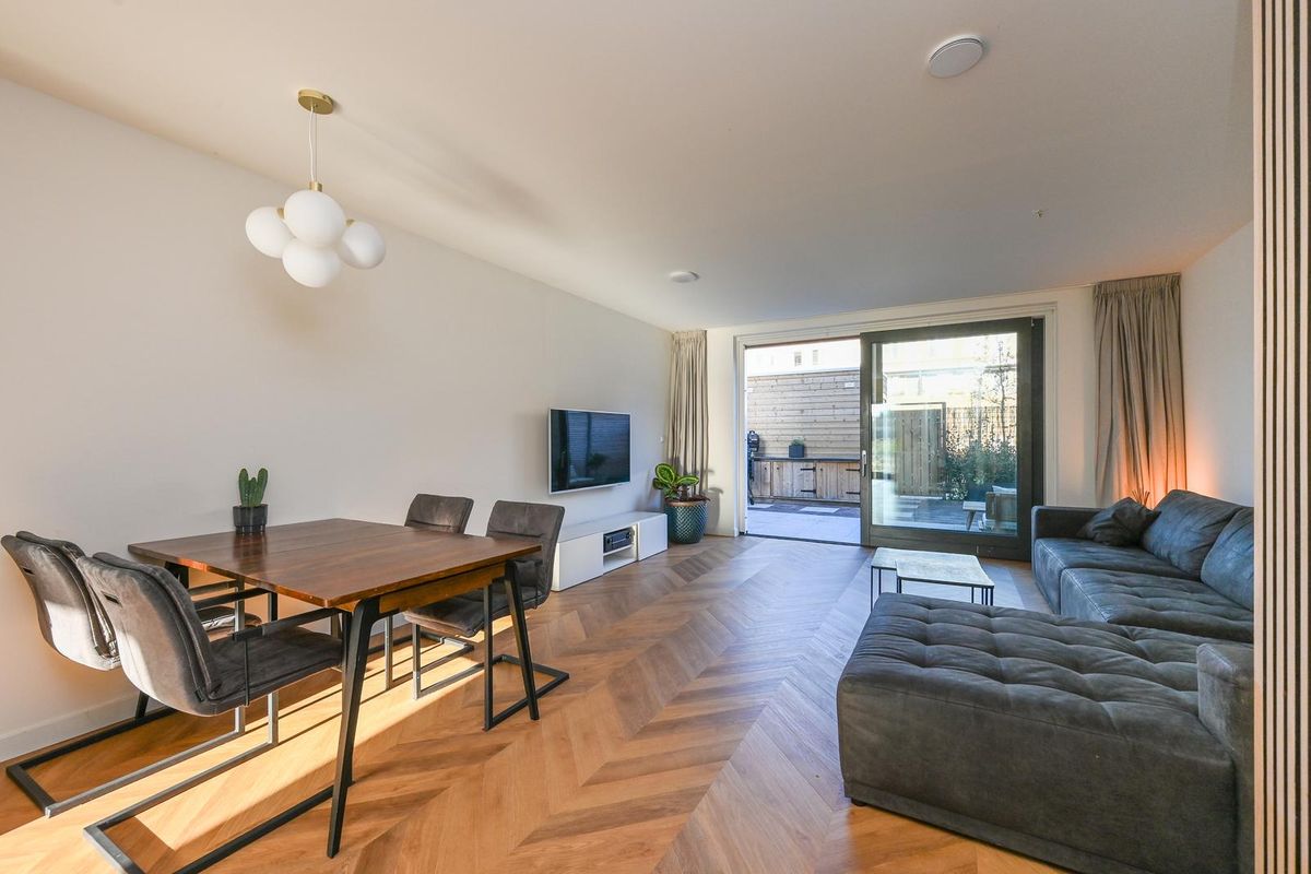 Aan de voorzijde ligt de verzorgde keuken in dubbele rechte opstelling, met veel werk- en kastruimte. De keuken is uitgerust met hoogwaardige inbouwapparatuur, waaronder een AEG-inductiekookplaat met geïntegreerde afzuiging, vaatwasser, oven, magnetron, grote koelkast en vriezer. Dankzij een extra deur naar de voortuin geniet u hier van extra lichtinval, ideaal voor een ochtendkoffie in de zon.