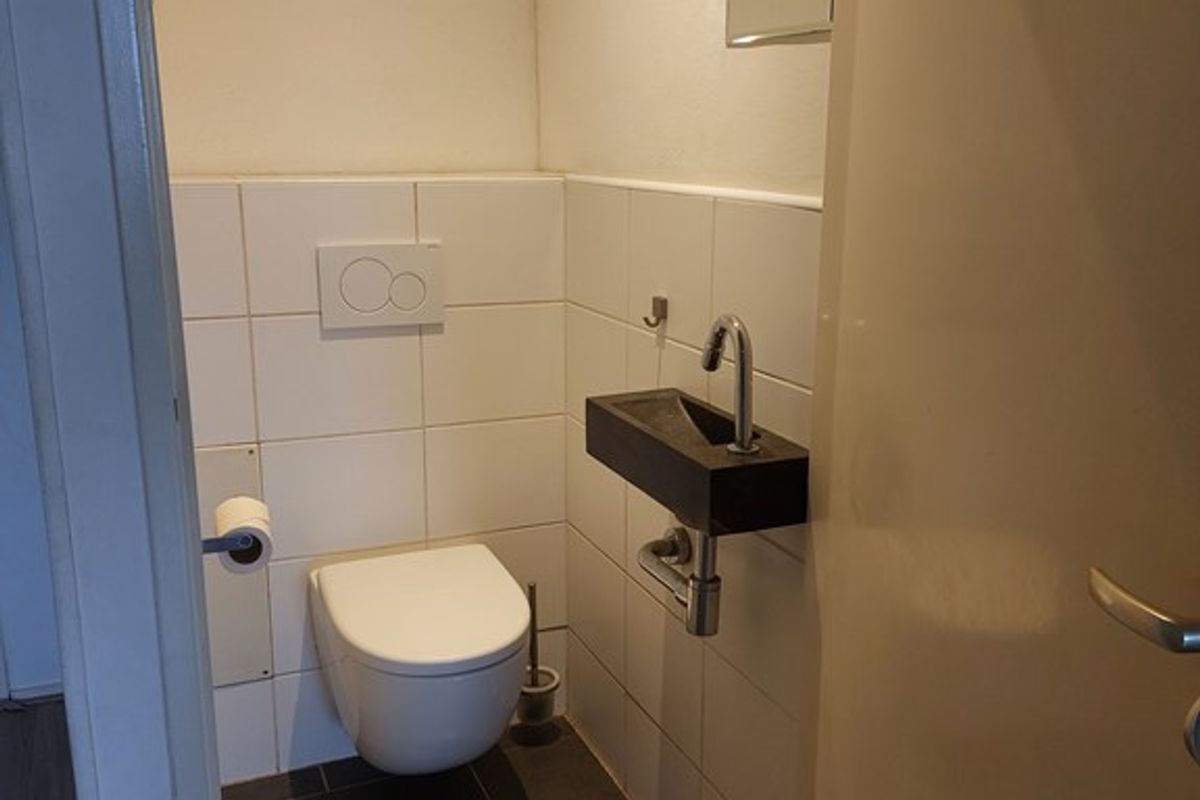 Entree/hal, groepenkast, vaste kast, modern toilet met fonteintje.