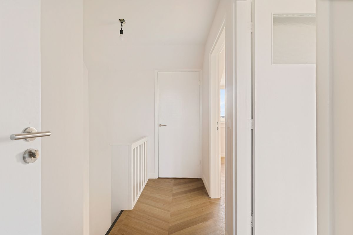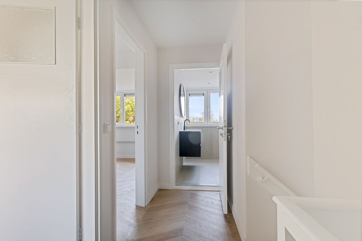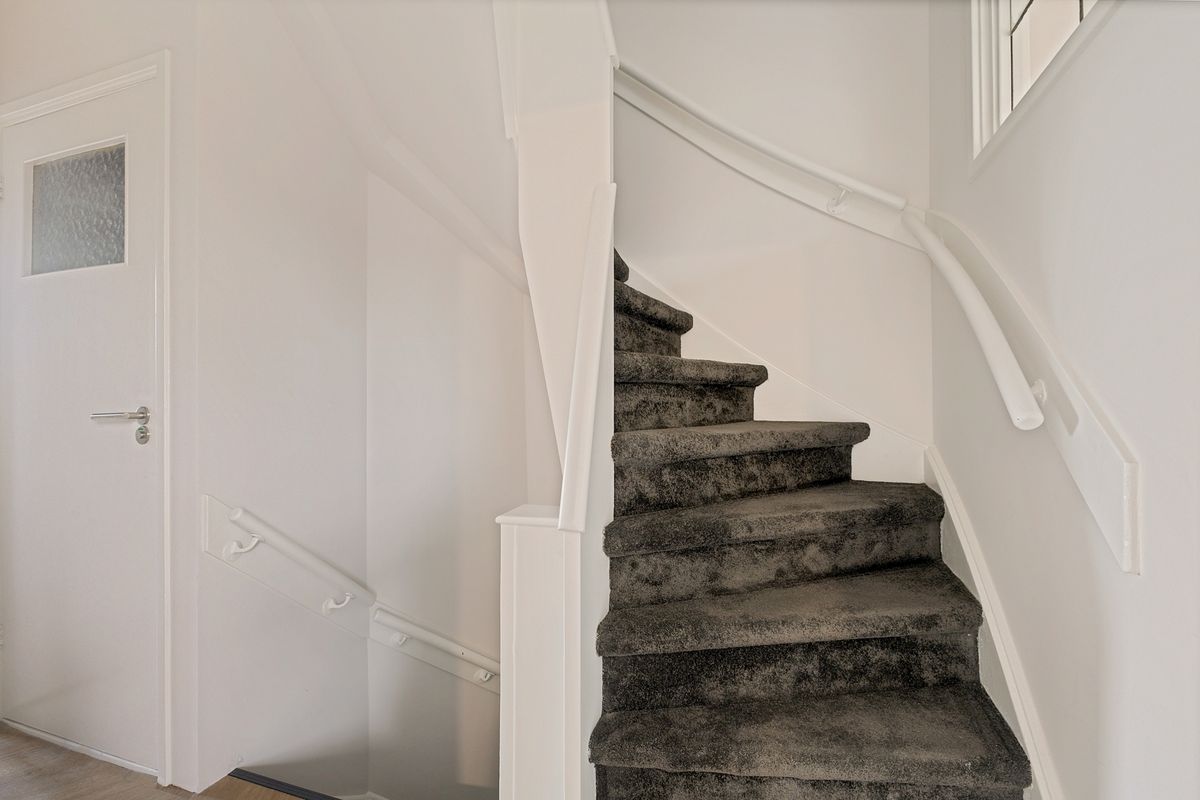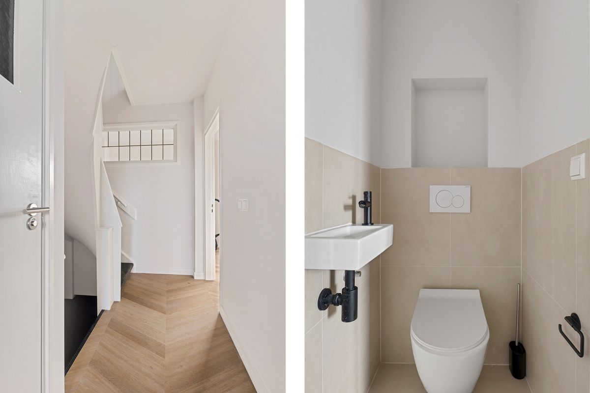 The staircase leads to the second floor, where the hallway provides access to two spacious bedrooms at the front and back, as well as the bathroom and laundry room. The bathroom features a luxurious walk-in shower, a single washbasin, and a designer radiator.