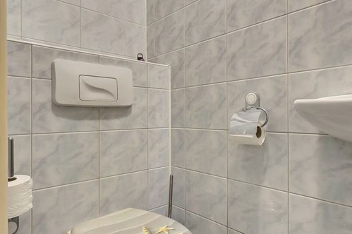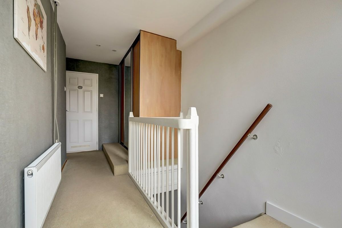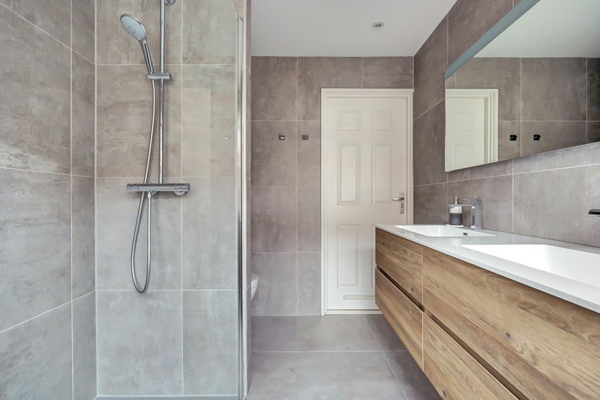 Op de eerste verdieping is de indeling als volgt: overloop met toegang tot dakterras/balkon, twee prima slaapkamers (456 x 257 en 397 x 257) en de moderne in 2021 vernieuwde grote badkamer (295 x 212, gerealiseerd in een voormalige slaapkamer) met inloopdouche, tweede toilet en badkamermeubel met dubbele wastafel.