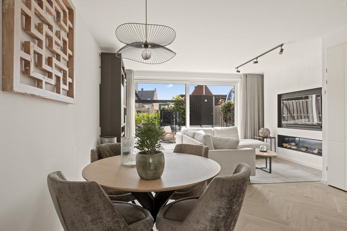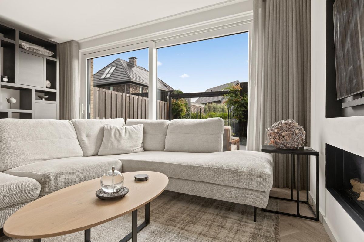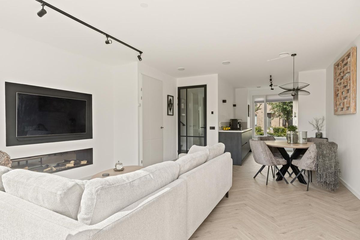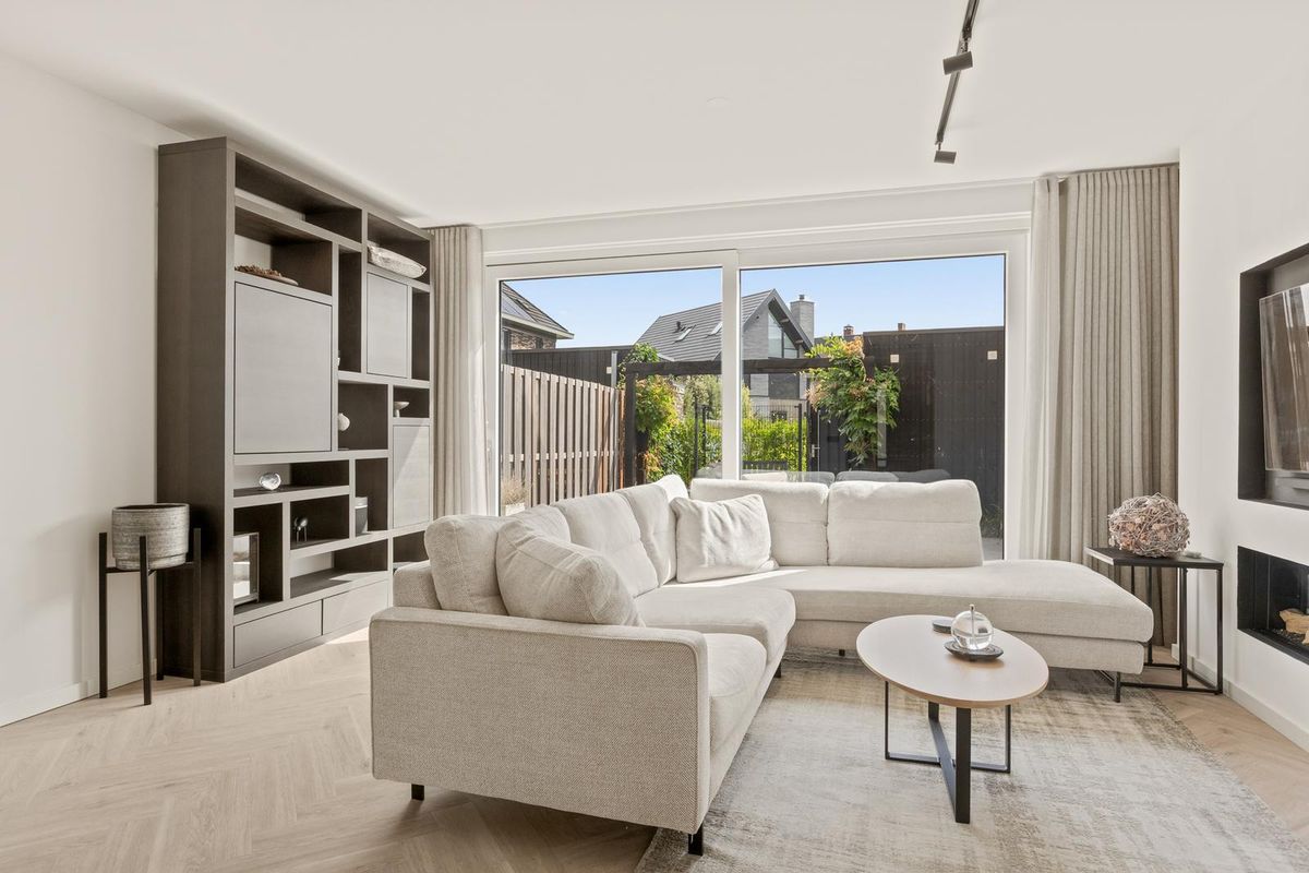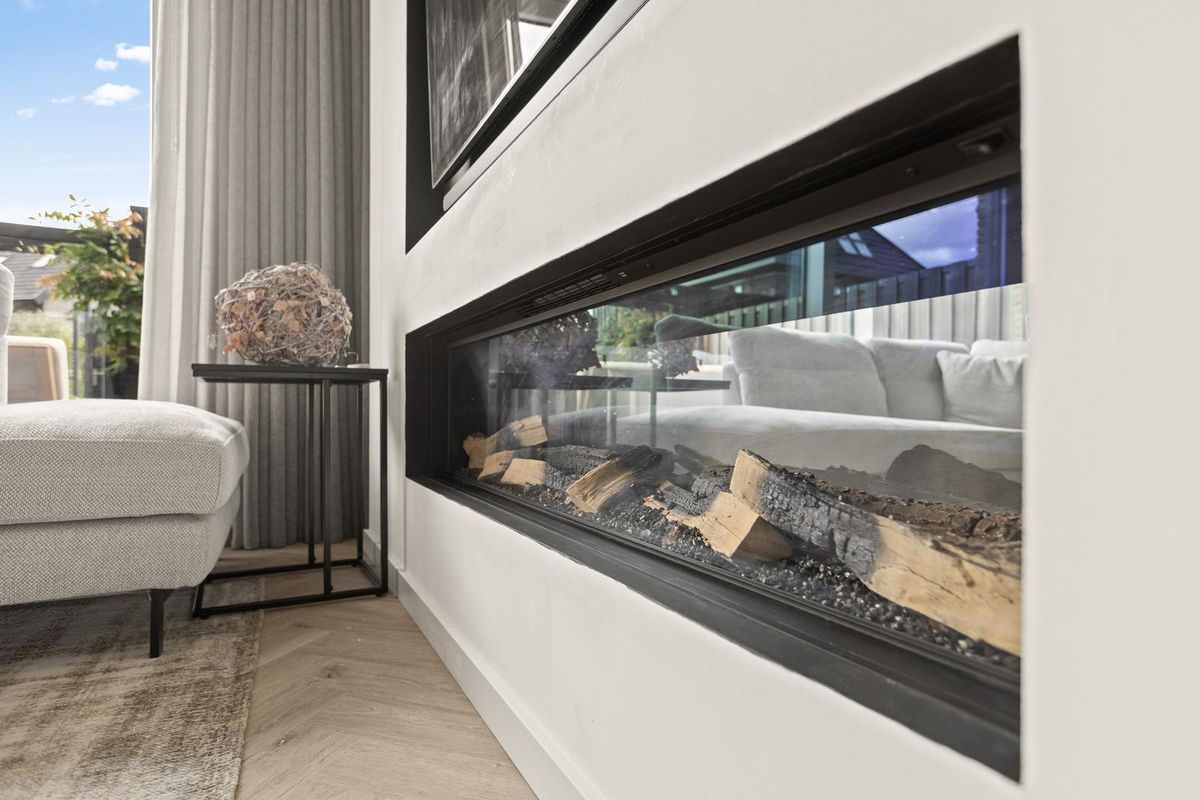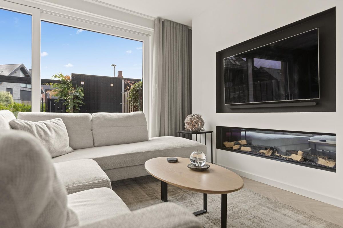 Je komt binnen via de sfeervolle hal en loopt door naar de woonkamer. Wat direct opvalt, is hoe strak en modern de woning is ingericht. Alle details sluiten mooi op elkaar aan waardoor de woonkamer een uitnodigende plek is – of je nu wilt ontspannen op de bank of gezellig wilt loungen met vrienden en familie. De ingebouwde elektrische haard in de haard/tv-wand met warmte-element zorgt daarbij voor extra sfeer en comfort, het hele jaar door.