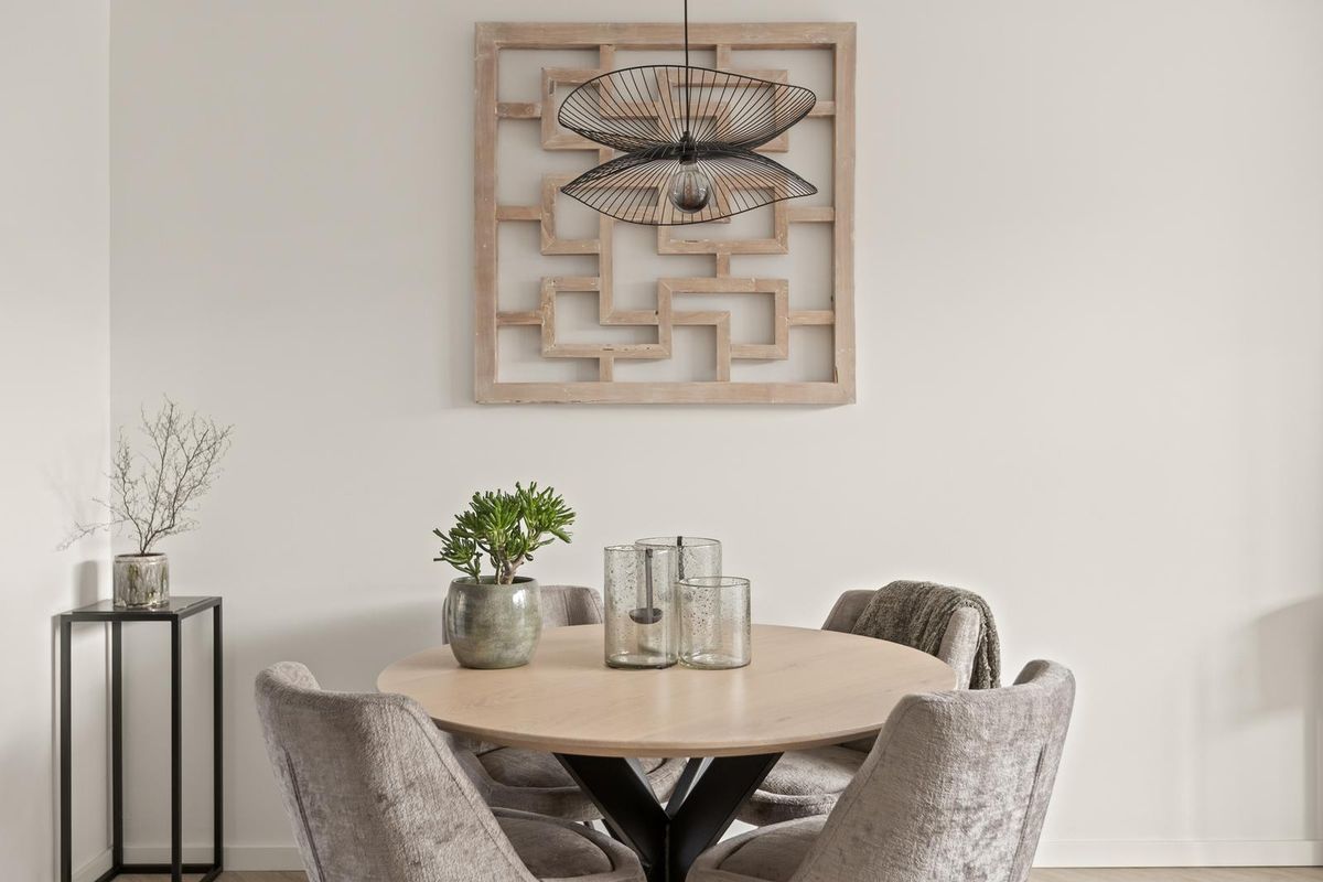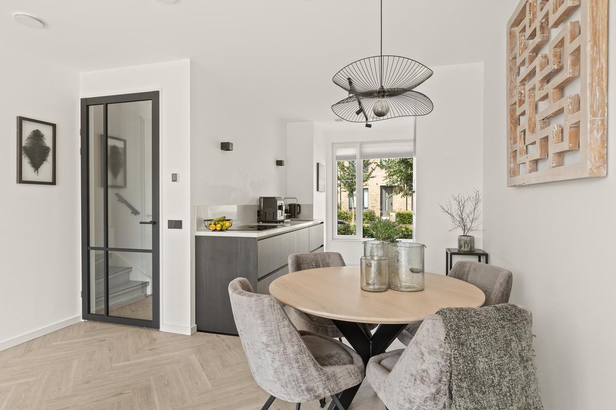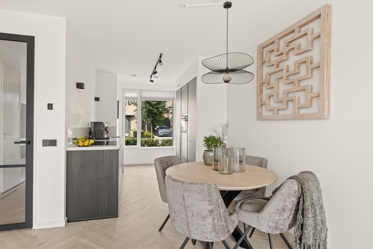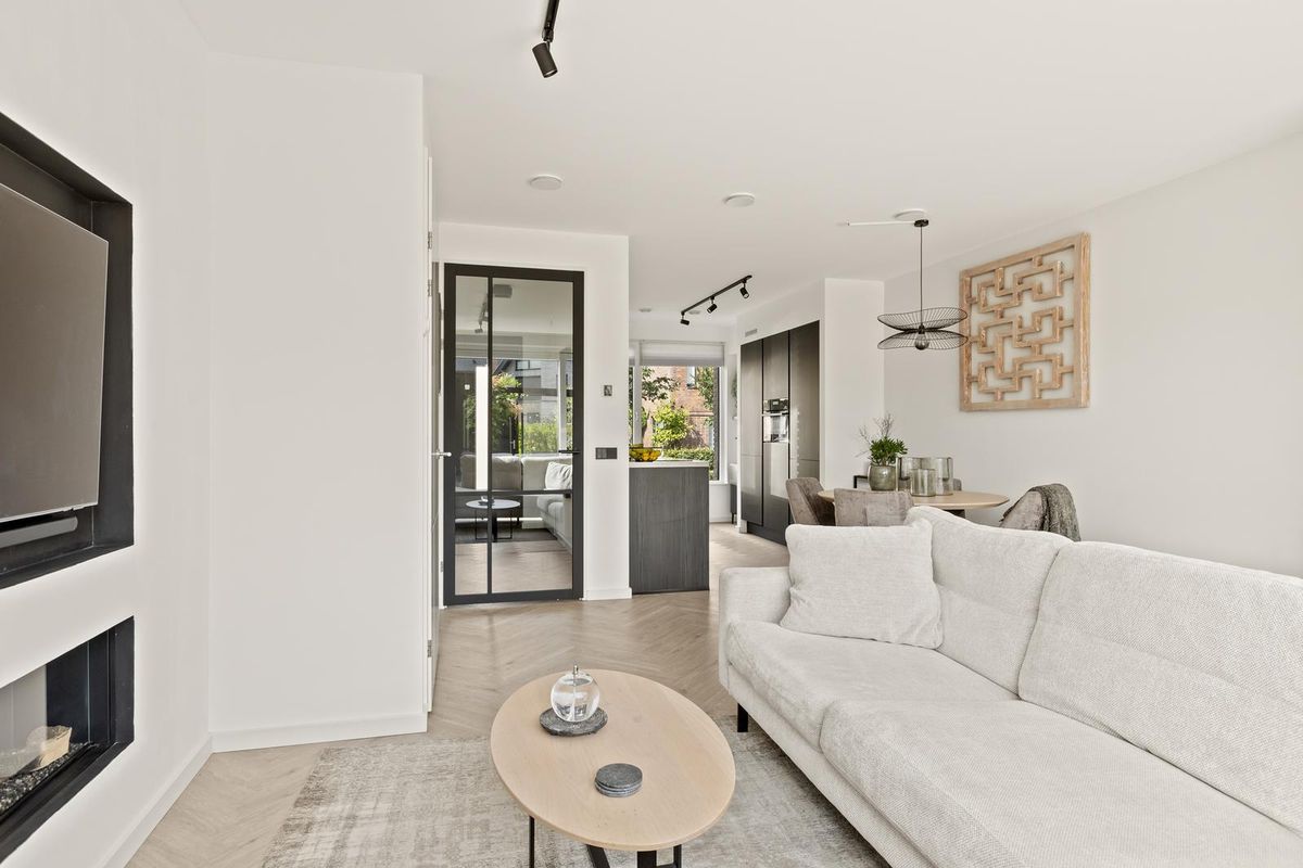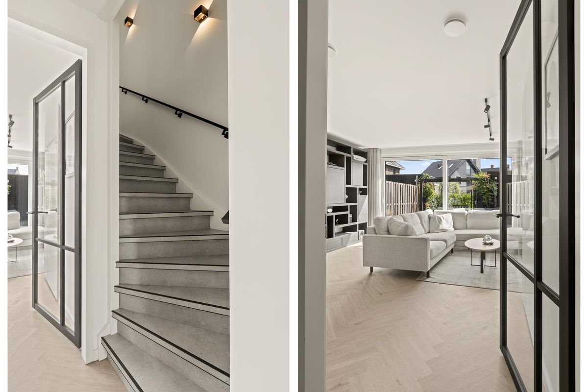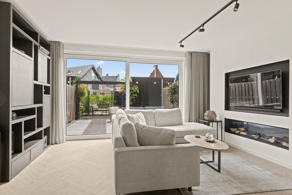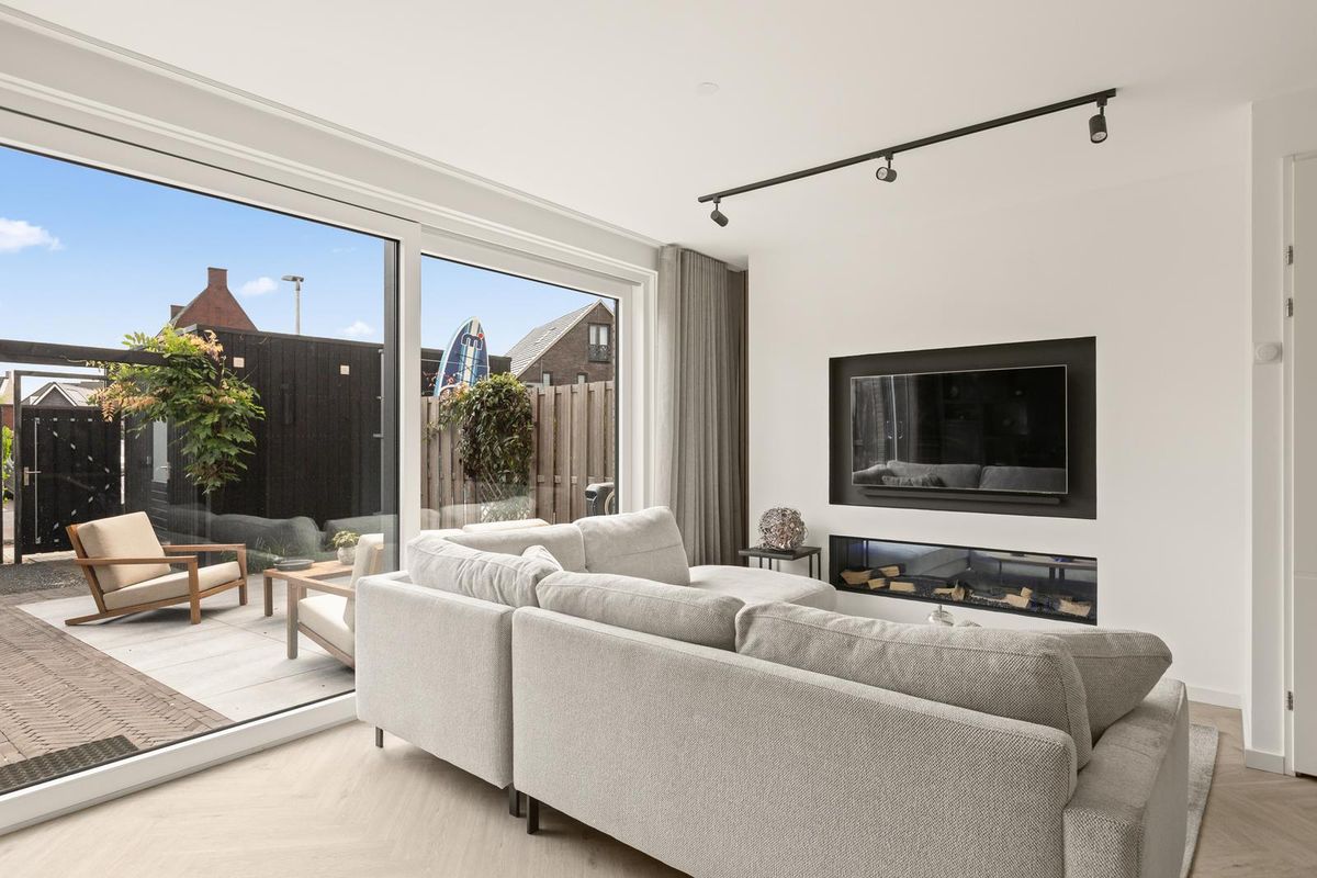 Je komt binnen via de sfeervolle hal en loopt door naar de woonkamer. Wat direct opvalt, is hoe strak en modern de woning is ingericht. Alle details sluiten mooi op elkaar aan waardoor de woonkamer een uitnodigende plek is – of je nu wilt ontspannen op de bank of gezellig wilt loungen met vrienden en familie. De ingebouwde elektrische haard in de haard/tv-wand met warmte-element zorgt daarbij voor extra sfeer en comfort, het hele jaar door.