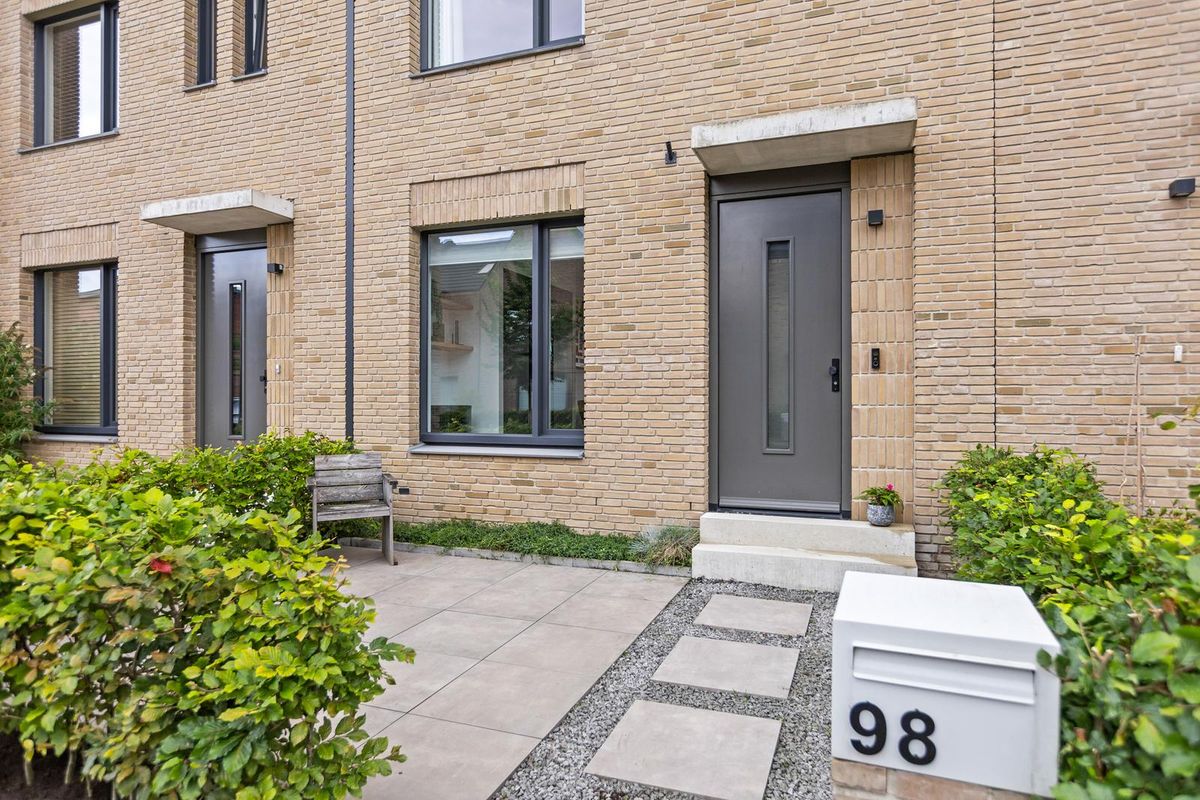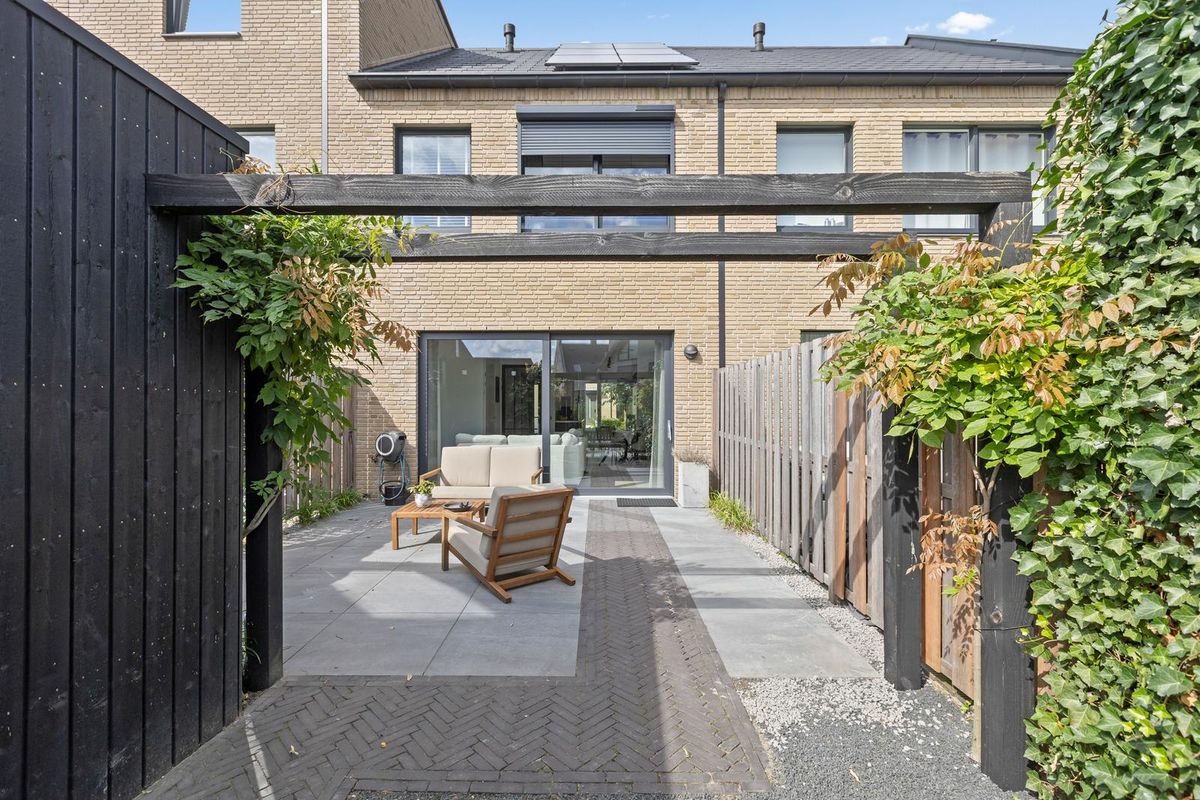Via de glazen schuifpui, die zorgt voor prachtig daglicht in de woonkamer, stap je zo de achtertuin in. Deze tuin is deels bestraat met keramische tegels en heeft een strak design. Er is volop ruimte voor een terras en een fijne loungeset. Achterin de tuin staat een praktisch schuurtje voor fietsen en tuinspullen, en via de handige achterom heb je directe toegang tot je twee eigen parkeerplaatsen.