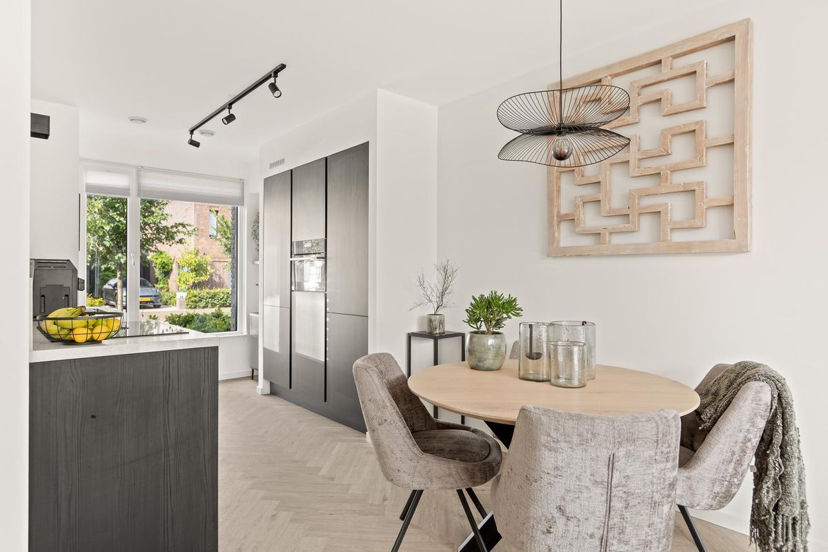 In de woonkamer is er volop ruimte voor een grote eettafel waar je samen kunt dineren of borrelen. Aan de voorzijde van de woning ligt de moderne keuken uit 2022. Deze keuken is niet alleen een plaatje om te zien, maar ook een feestje om in te koken. Voorzien van alle gewenste inbouwapparatuur zoals een Bora inductiekookplaat met geïntegreerde afzuiging, vaatwasser, combi-oven, koel-vriescombinatie én een overvloed aan kastruimte dankzij de dubbele opstelling. Vanuit de keuken kijk je fijn uit over de straat en valt het natuurlijke licht prachtig binnen. Het natuurstenen werkblad maakt het geheel helemaal af.