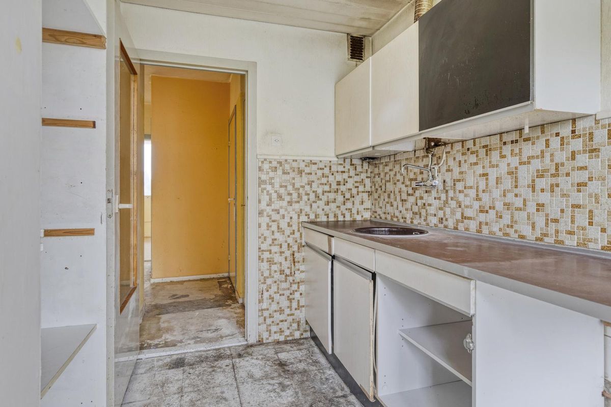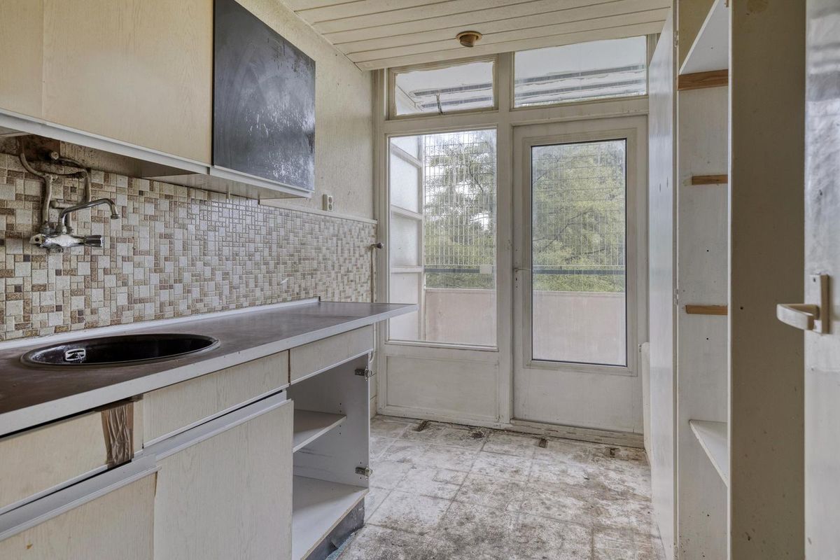 * Keukenruimte voorzien van functionele keukenopstelling, de opstelling van de geiser, wasmachine-aansluiting, een vaste kast en een deur naar het balkon.