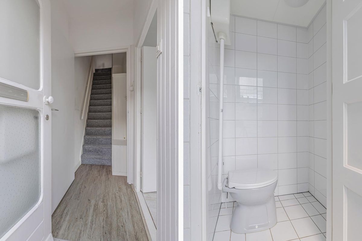 Via de voortuin bereik je de hal naar de verdieping, waar ook een zelfstandig appartement gerealiseerd is. Via deze hal treft u ook de doorgang aan richting de woonkamer. In de woonkamer ligt een laminaatvloer en aan de voorzijde treft u een sfeervolle erker aan. Via deze ruimte komt u in de keukenruimte. Deze is voorzien van een rechte keukenopstelling, voorzien van diverse apparatuur. Achter deze ruimte ligt ook de badkamer en de wasmachine en droger ruimte. Via de bijkeuken bereikt u ook de achtertuin met een berging en een achterom.