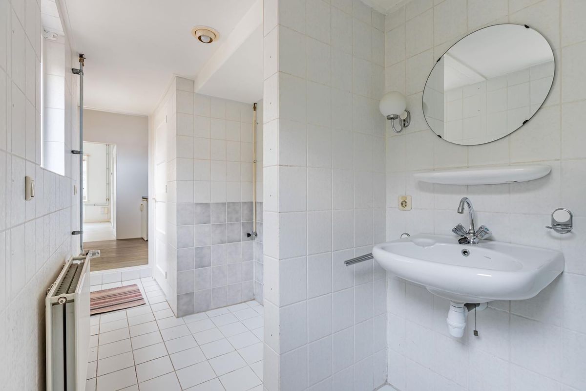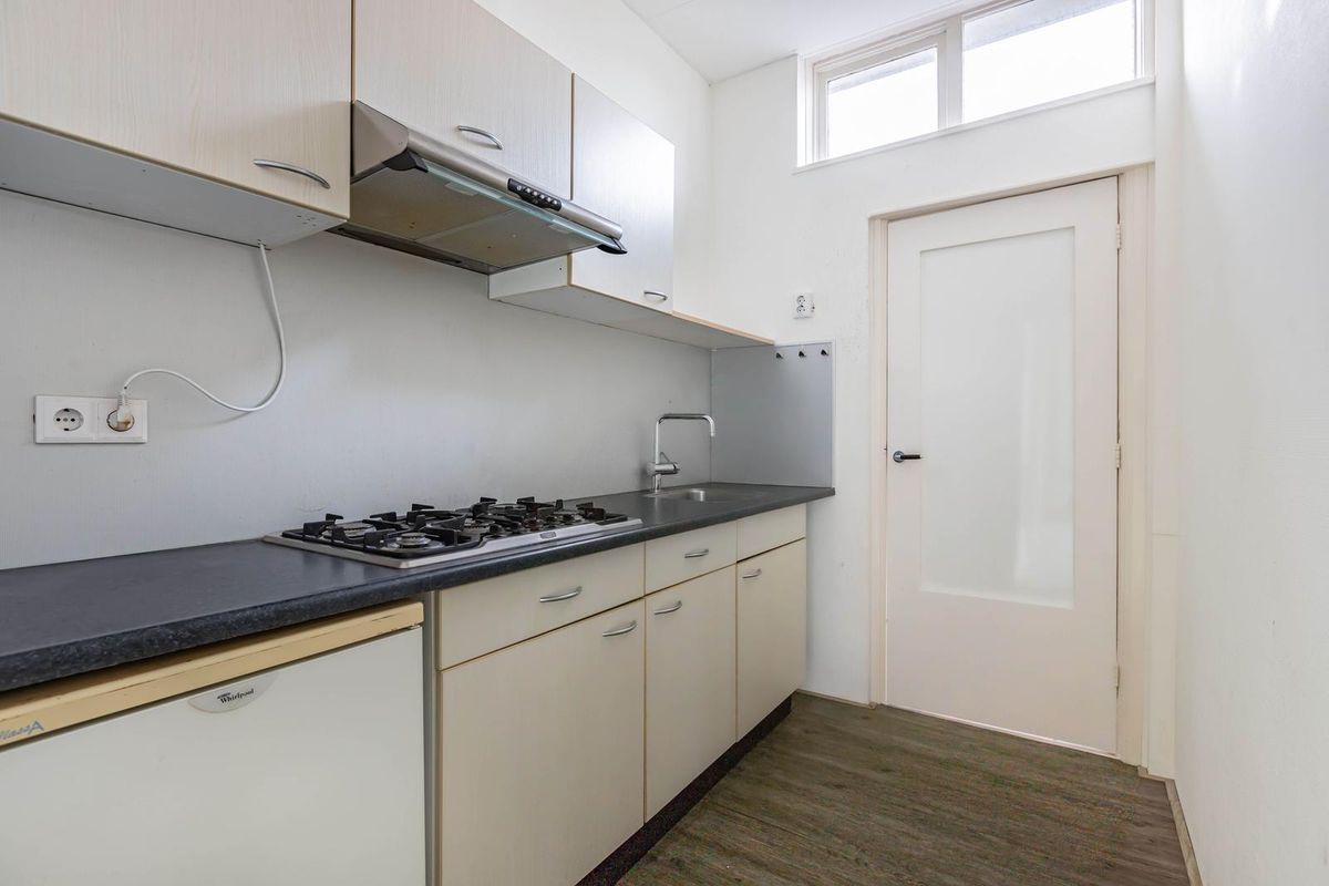 De overloop geeft toegang aan de ruime slaapkamer/woonkamer aan de voorzijde. Hier treft u ook een keukenblok aan en u bereikt de badkamer via de overloop. Deze is voorzien van een toilet, douche en een wastafel.