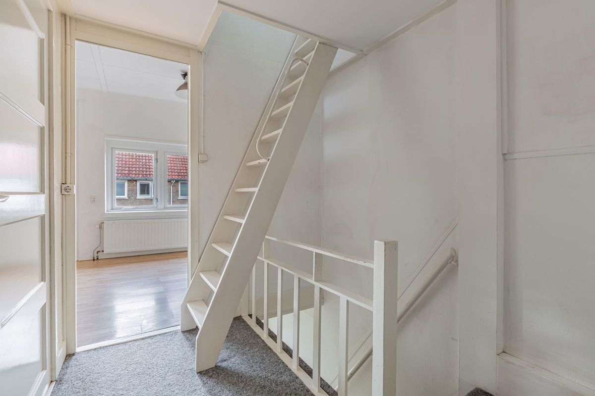 Middels een vaste trap bereikt u de zolder met een extra slaapruimte en vaste kasten.