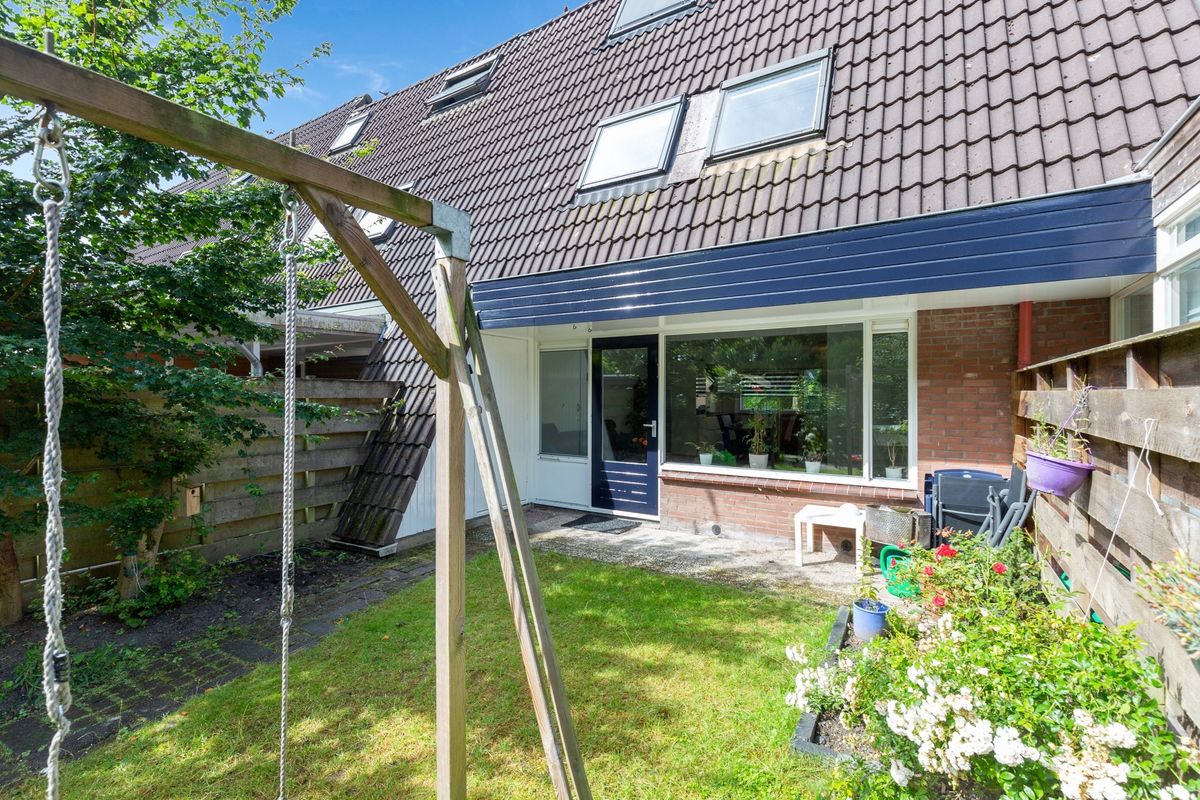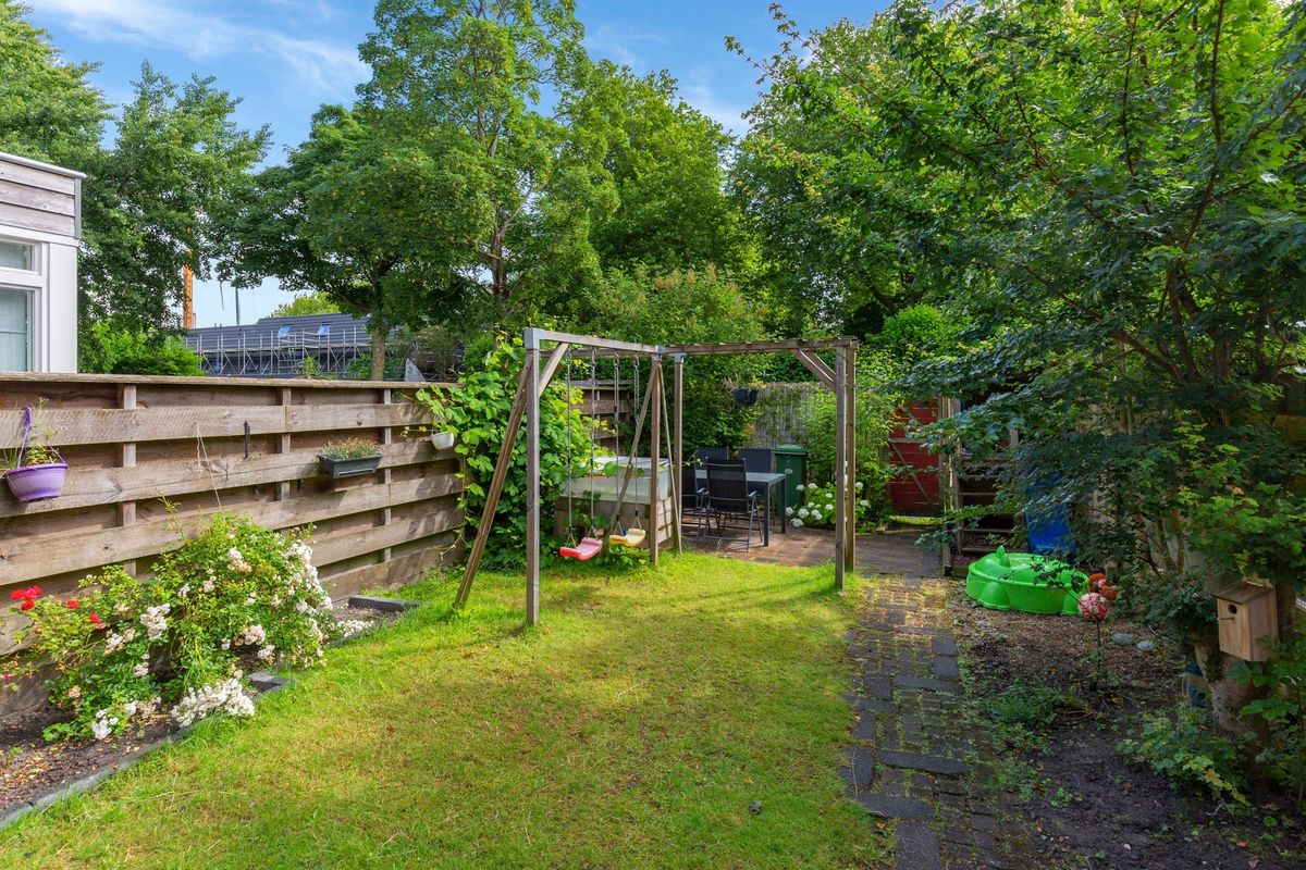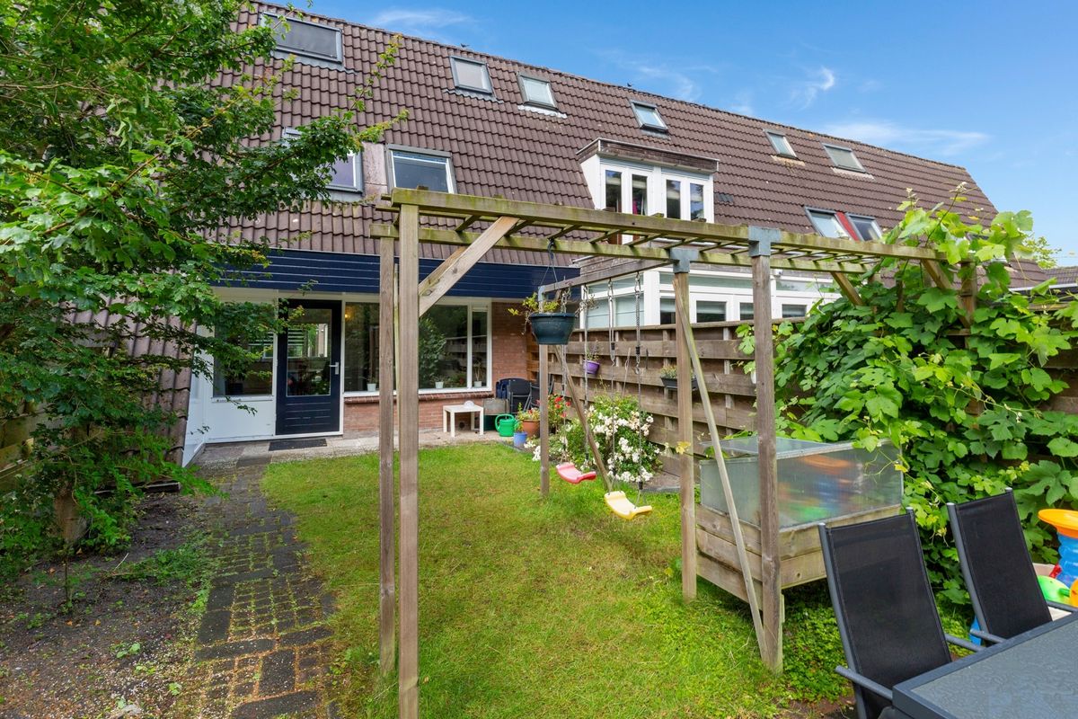 De diepe achtertuin ligt op het noordoosten (ochtendzon), maar dankzij de diepte is er de hele dag zon. De tuin is voorzien van een berging, afdak en achterom. Aan de voorzijde is een extra berging gerealiseerd doordat de voormalige garage is omgebouwd, met behoud van een praktische bijkeuken.