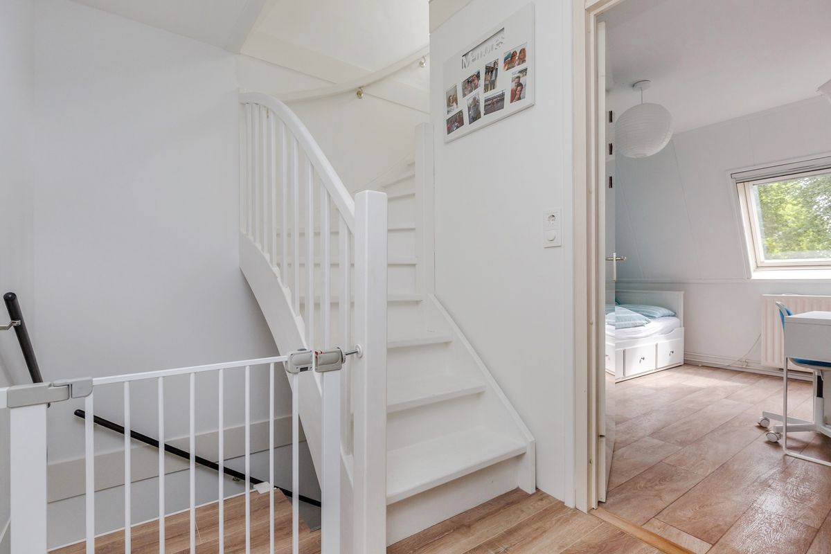 Overloop met toegang tot drie slaapkamers en de badkamer. De slaapkamers aan de achterzijde zijn voorzien van een dakraam. De slaapkamer en badkamer aan de voorzijde beschikken over kunststof kozijnen. De badkamer is geheel betegeld en uitgerust met een douche, tweede toilet en wastafel.