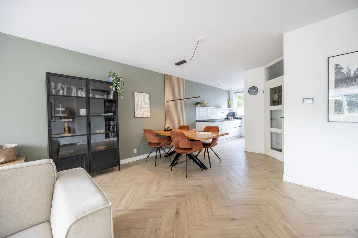 De tuingerichte woonkamer is aan de achterzijde uitgebouwd met een lichte serre, waar nu twee fauteuils staan om heerlijk in de zon te zitten. Verder biedt de woonkamer meer dan genoeg ruimte voor een grote hoekbank, tv-meubel, een speelplek voor de kinderen en de eettafel. Dit is een woonkamer met stijl en sfeer, waar je al snel kunt beginnen met inrichten.
