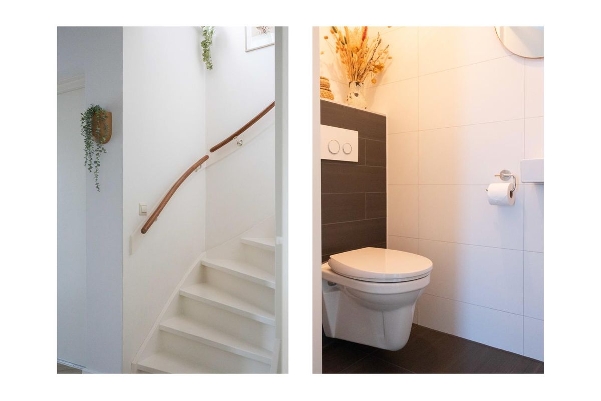 Parkeer de auto op de oprit, er kunnen er twee naast elkaar staan, en loop vervolgens naar de overdekte entree. In de sfeervolle hal zijn de meterkast, de lichte trapopgang en de toiletruimte met fonteintje. De fraaie keramische tegelvloer, in het geliefde visgraatmotief, ligt ook in de woonkamer en keuken. De gehele vloer beneden is voorzien van vloerverwarming.