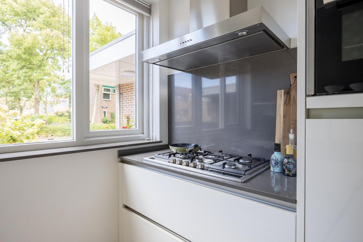 Aan de voorzijde is de keuken, waar aan twee kanten een moderne wandopstelling staat. Het aanrechtblad is van composiet, aan bergruimte is geen gebrek en alle benodigde apparatuur is ingebouwd: een 5-pits gaskookplaat, afzuigkap, vaatwasser, oven, combimagnetron, koelkast en een vriezer. Ook is er een Quooker kraan geïnstalleerd. En het uitzicht tijdens het koken? Een heerlijk rustige straat en een klein parkeerterrein met mooie bomen!