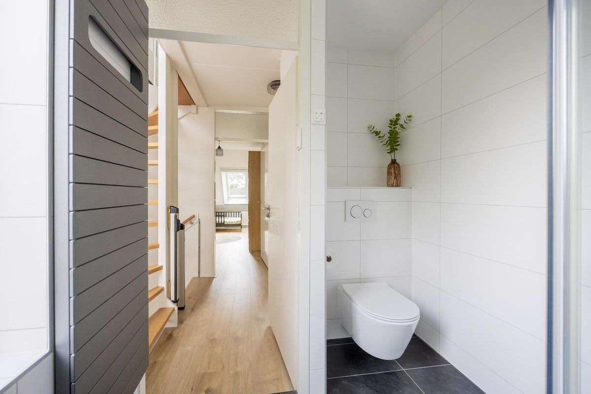 De badkamer hoeft, net als de rest van de woning, niet verbouwd te worden. Grote, lichte wandtegels zijn gecombineerd met donkere vloertegels en fraai sanitair. De inloopdouche is extra ruim, en het brede wastafelmeubel met spiegelkast is perfect voor twee personen. Ook zijn er een tweede toilet en een designradiator in deze fraaie badkamer.