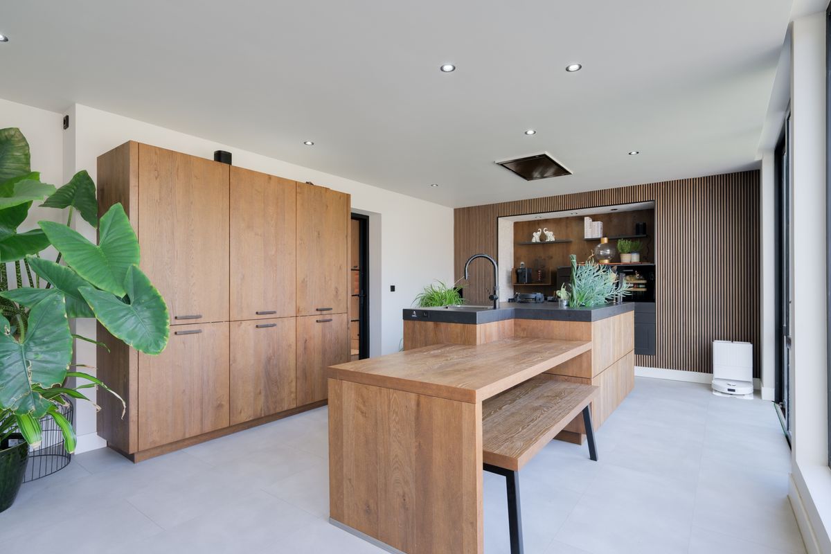 Begane grond: Entree met meterkast, voorraadkelder en trapopgang. Ruime woonkamer met cinewall, aparte speel- of werkkamer en een uitgebouwde woon-eetkeuken over de volle breedte van de woning met glazen achtergevel en luxe keukenmeubel met kookeiland (inbouw-apparatuur o.a. vaatwasser, afzuiging verwerkt in plafond, 3 gaspitten in het werkblad, koel-vriescombinatie, wijnklimaatkast, combi-stoomoven. Riante hoofdslaapkamer met aangrenzende moderne badkamer ( dubbele wastafel met meubel, inloopdouche met twee douches en toilet), grote bijkeuken met wasruimte, toilet en extra achter-entree.