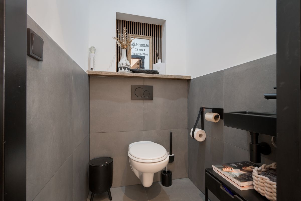 Verdieping: Overloop, drie slaapkamers waarvan één in gebruik als inloopkast, tweede badkamer met inloopdouche, wastafel en toilet. Vlizotrap naar bergzolder.