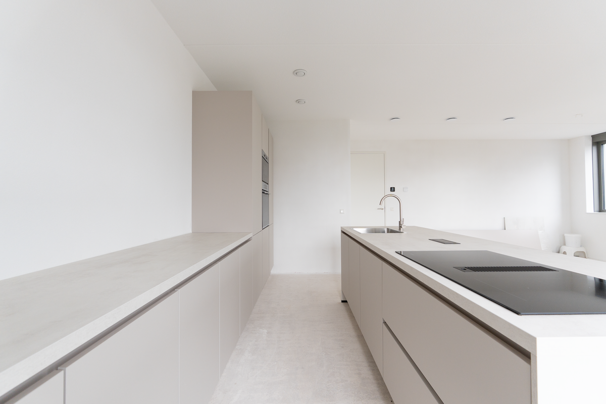 De open keuken met groot kookeiland vormt het hart van de ruimte. De keuken is voorzien van moderne, gloednieuwe apparatuur van o.a. Whirlpool: een koelkast, oven en magnetron. De inductiekookplaat met geïntegreerde afzuiging zorgt voor een strak en praktisch geheel.